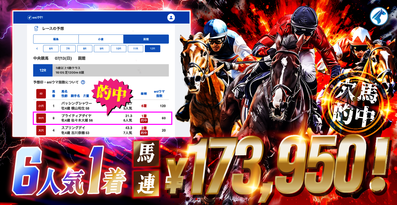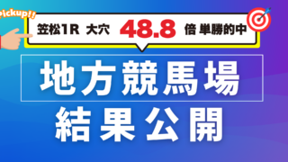 こんばんは、eniウマ!開発スタッフです。本日は浦和・笠松の2会場で開催されました。浦和競馬場:9/12笠松競馬場:8/11浦和では8Rで中穴ニシノリピート35.9倍の単勝と、小穴が3着に入りダブル的中。続く9Rでも中穴フォーゲルヴァイデ1...