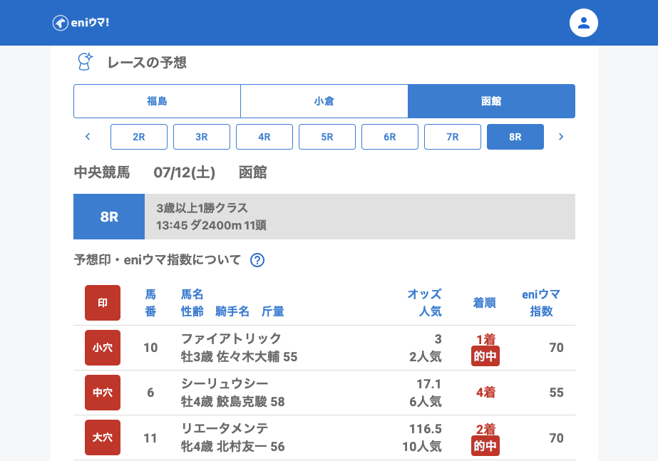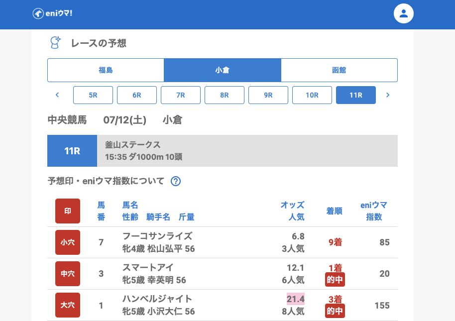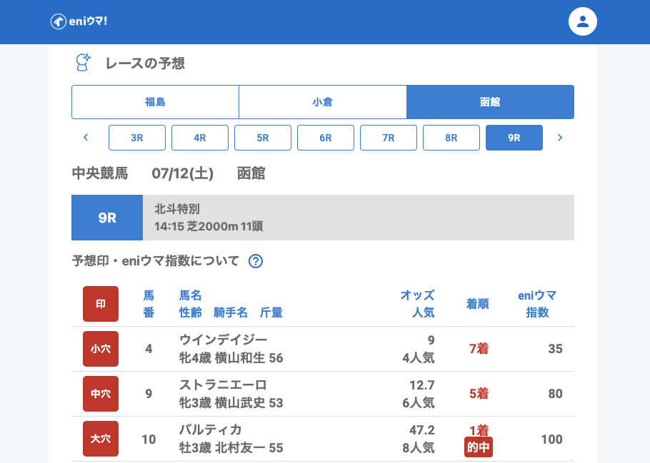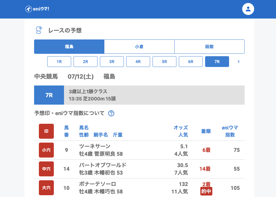 本日の中央競馬は、夏競馬らしい波乱含みの1日となりました。中でもバルティカ(47.2倍/eniウマ指数100)、ボナーテソーロ(132.0倍/eniウマ指数105) やリエータメンテ(116.5倍/eniウマ指数70)の激走には驚かされた方も多いのではないでしょうか。