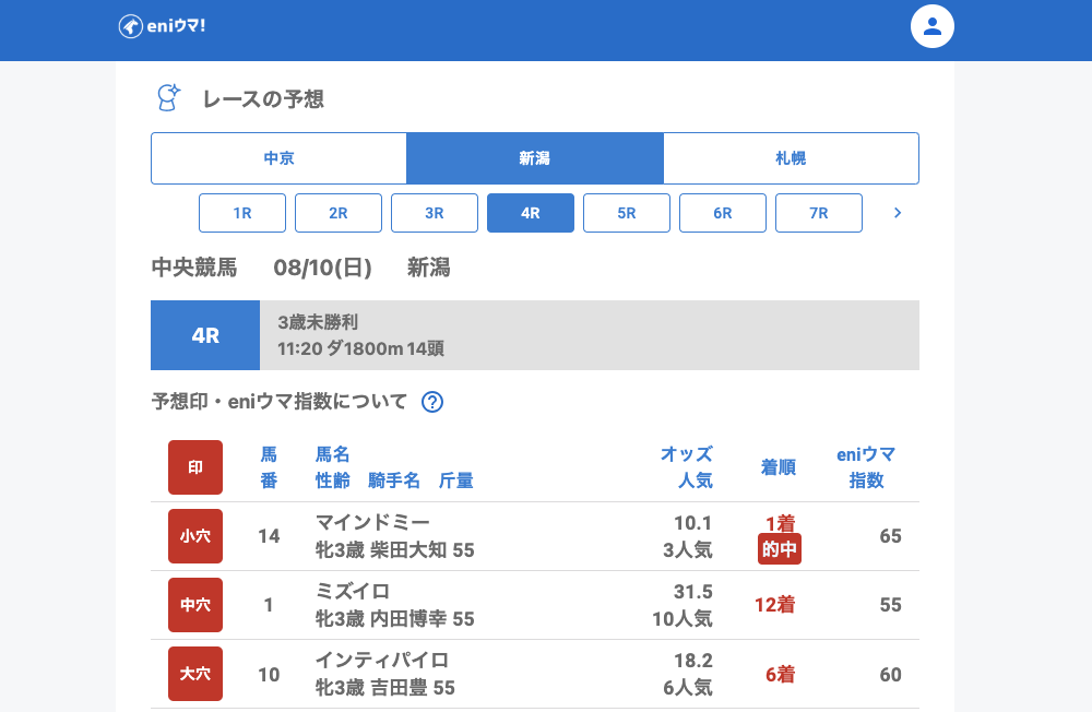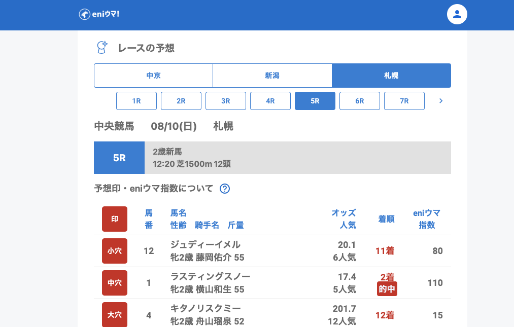 札幌記念の前座ともいえる札幌11Rでは、レッドヒルシューズ(30.4倍/eniウマ!指数140)が激走!さらにマインドミー(10.1倍/eniウマ!指数65)、ブレトワルダ(6.8倍/eniウマ!指数80)といった中穴も的中し、指数通りにしっかり結果を残してくれました。