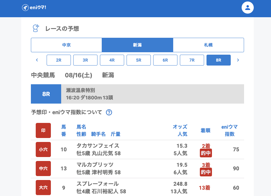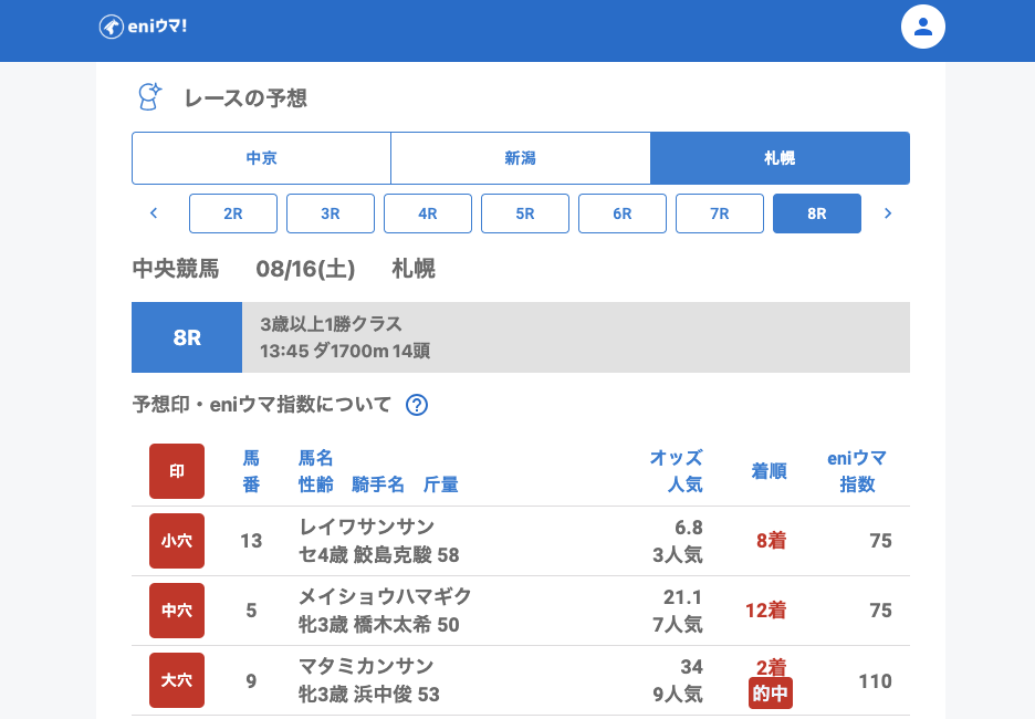 札幌7Rではラーシャローム(34.8倍/eniウマ!指数15)が低指数ながら単勝的中となり、AIがしっかり穴を見抜いた形に。