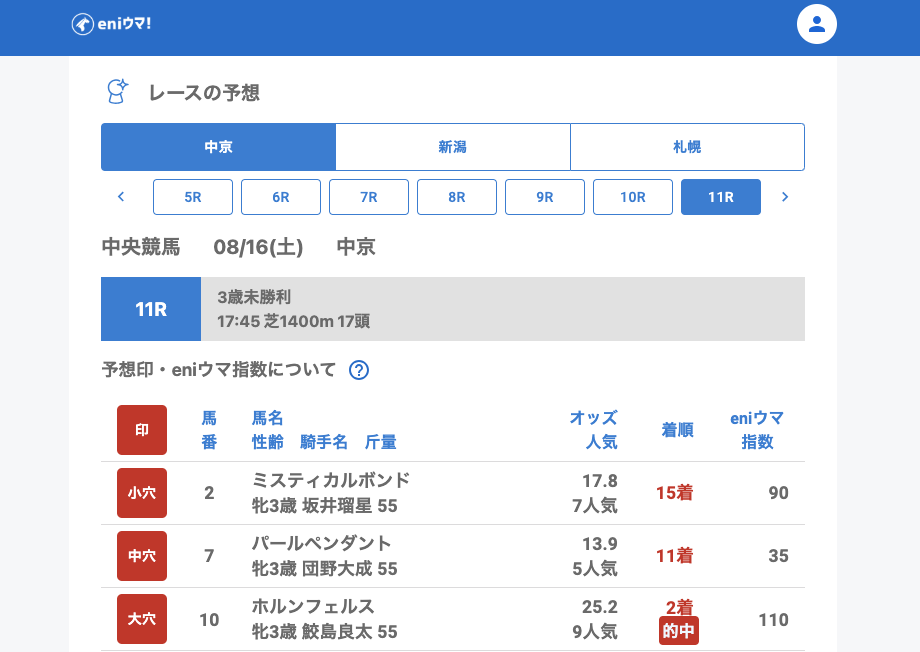 また、新潟や中京では、ミスティマウンテン(eniウマ!指数125)やショウナンバルドル(eniウマ!指数120)といった高指数馬が期待どおりに馬券圏内へ。