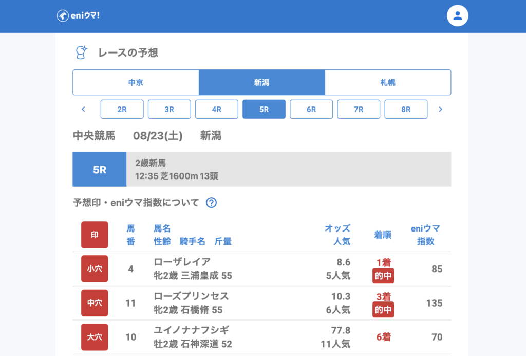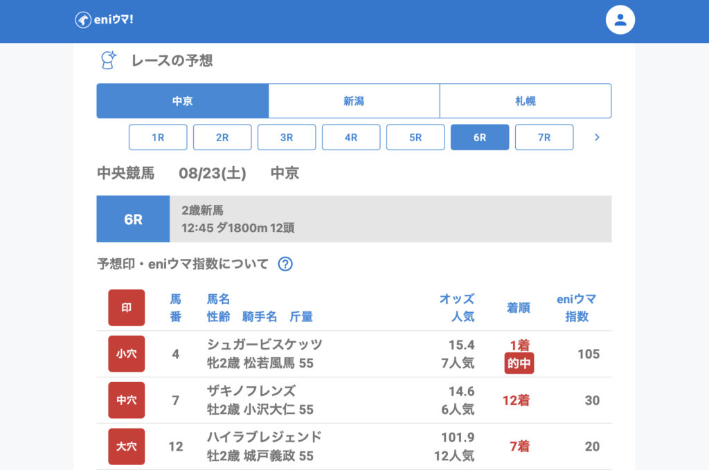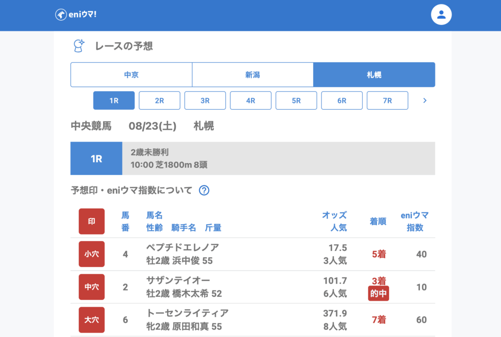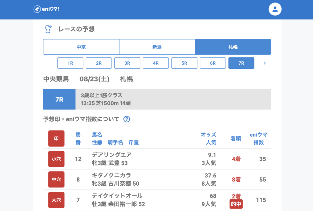 この日はタガノアニマシオン(27.2倍/eniウマ!指数110)、シュガービスケッツ、ローザレイア(8.6倍/eniウマ!指数85)などなど、単勝的中が複数出た点が大きな収穫でした。さらに札幌7Rではテイクイットオール(68.0倍/eniウマ!指数115)が2着に食い込み、しっかりと穴馬を推奨できています。