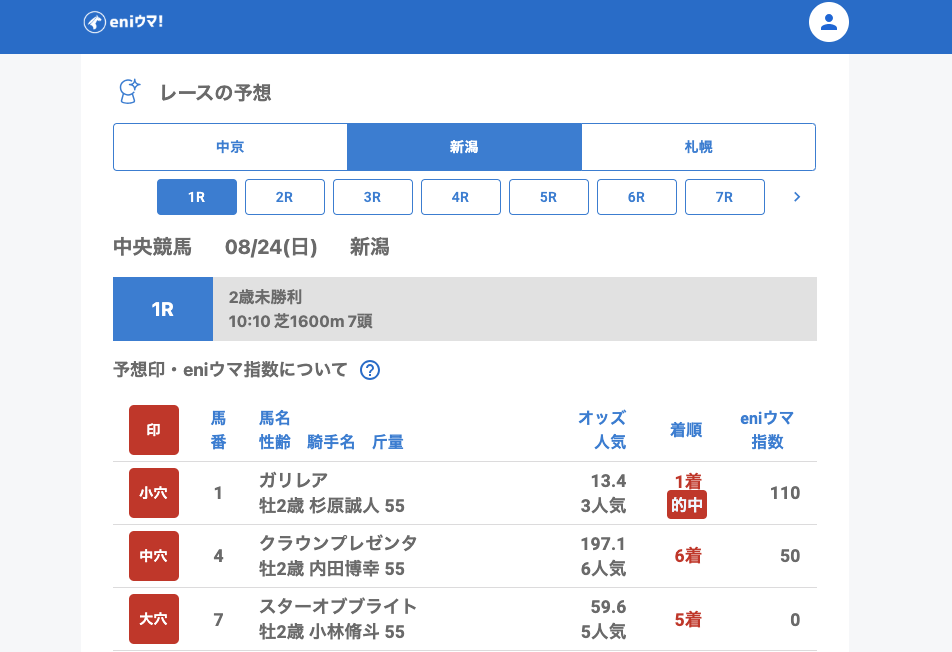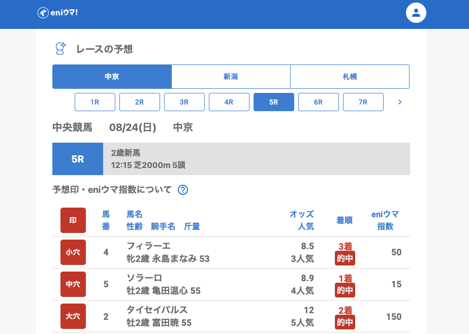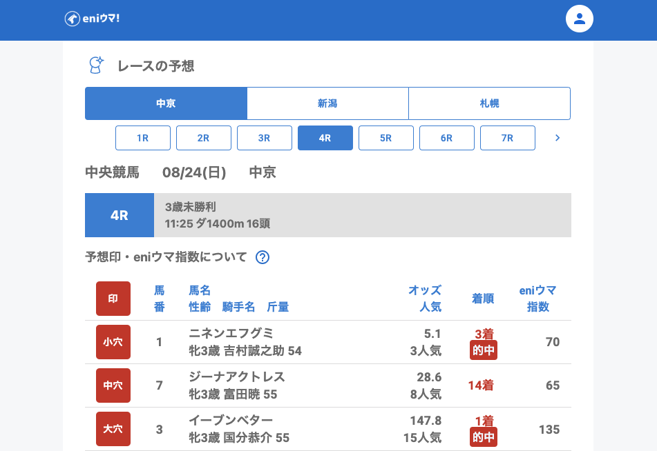 中京4Rではイーブンベター(147.8倍/eniウマ!指数135)が大きな一撃を演出。さらに中京5Rでは頭数が少なかったものの、小穴・中穴・大穴すべて的中と気持ちのいい結果になりました。