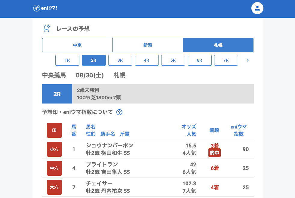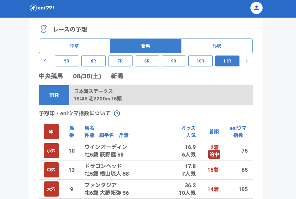 新潟では1R・3Rで小穴の単勝を発見することができ、中京11Rでは中穴推奨馬リチュアル(13.5倍/eniウマ!指数120)が7番人気ながら2着に好走。