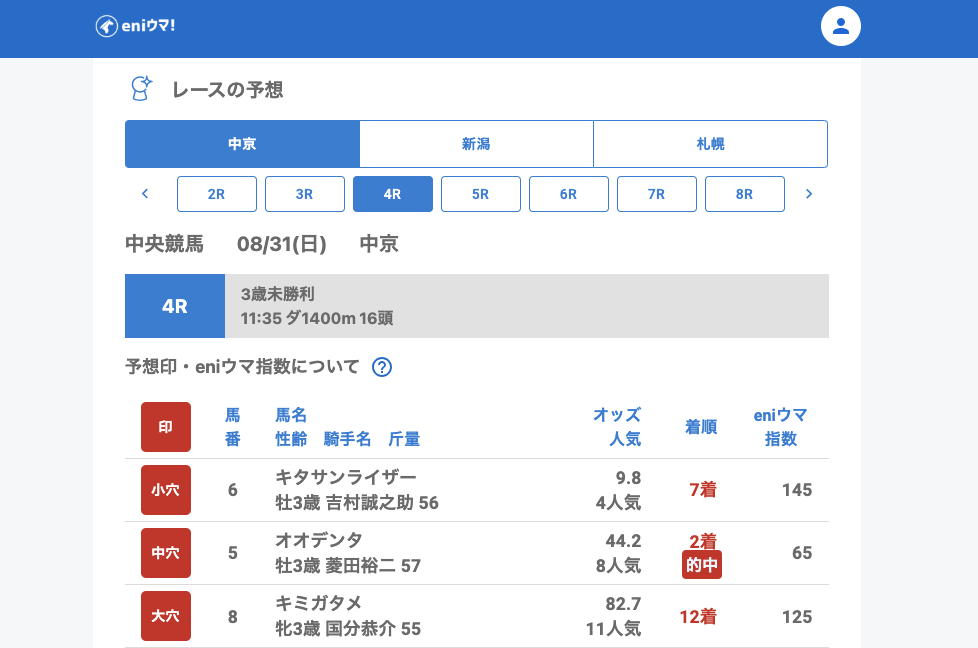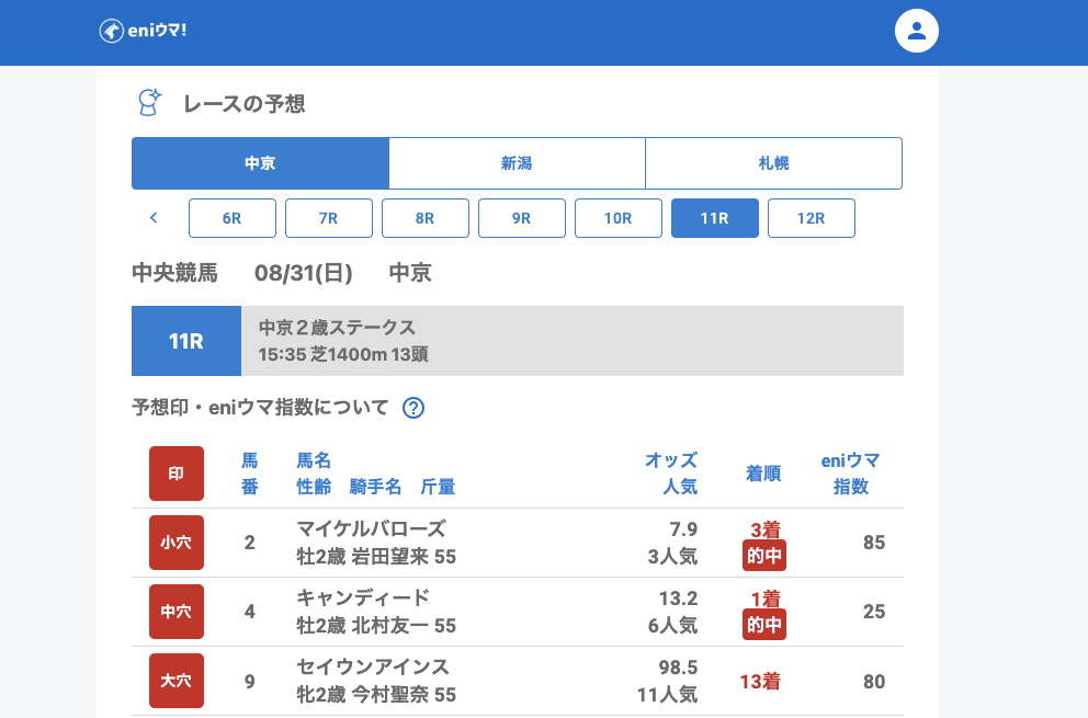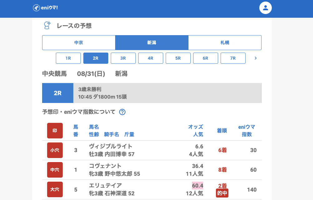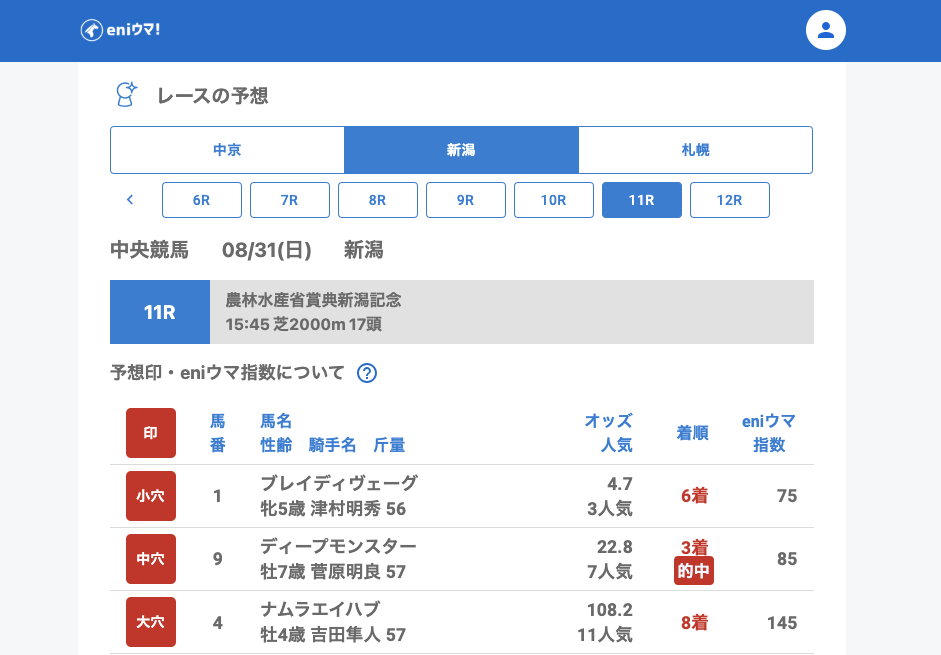 新潟では2Rで大穴エリュテイア(60.4倍/eniウマ!指数140)が2着、さらに11Rの新潟記念では中穴推奨ディープモンスター(22.8倍/eniウマ!指数85)が3着に入り存在感を見せました。