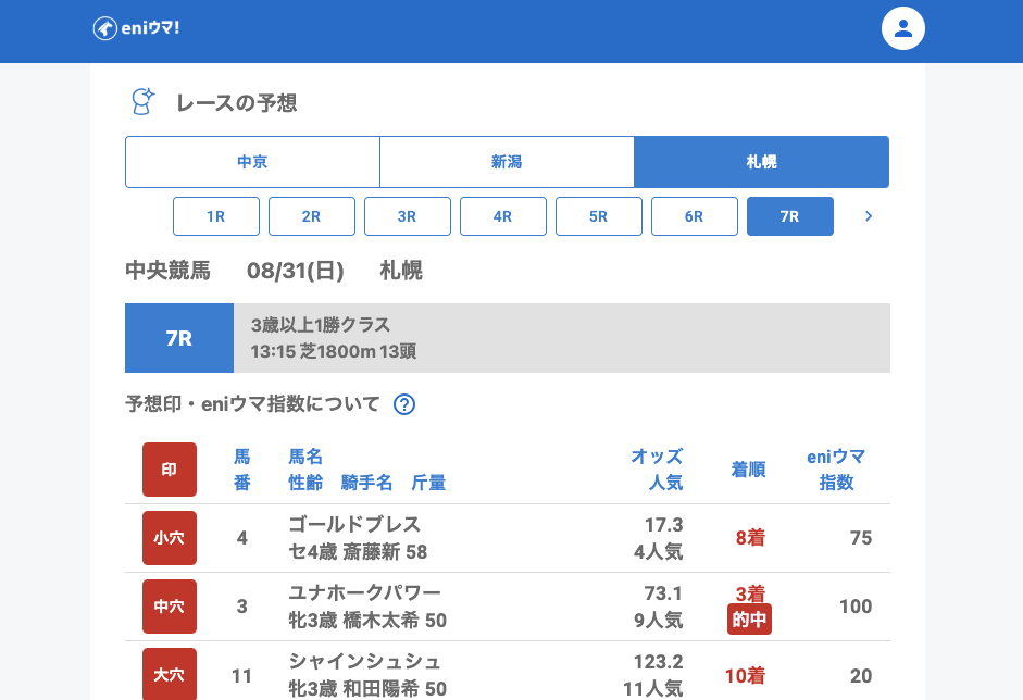 札幌では3Rで小穴と中穴のダブル的中。特に中穴セイルロケット(24.6倍/eniウマ!指数105)が指数高評価で2着と健闘し、7Rではユナホークパワー(73.1倍/eniウマ!指数100)が3着に食い込みました。