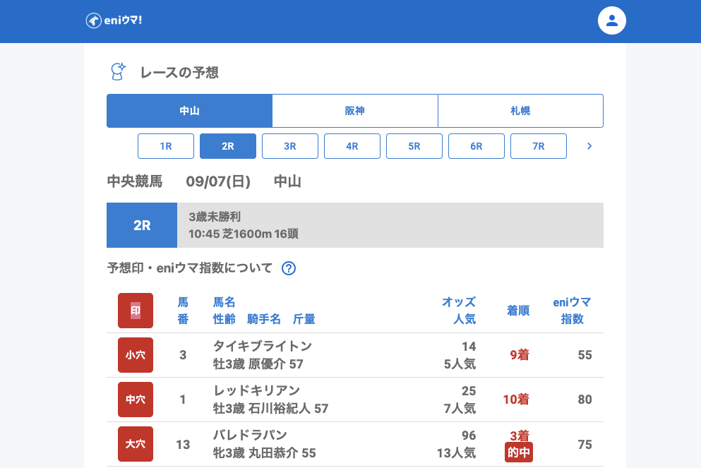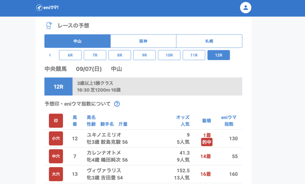中山では1Rリードアクトレス(63.0倍/eniウマ!指数55)、2Rバレドラパン(96.0倍/eniウマ!指数75)を発見し、12Rではユキノエミリオ(9.0倍/eniウマ!指数130)が単勝的中。