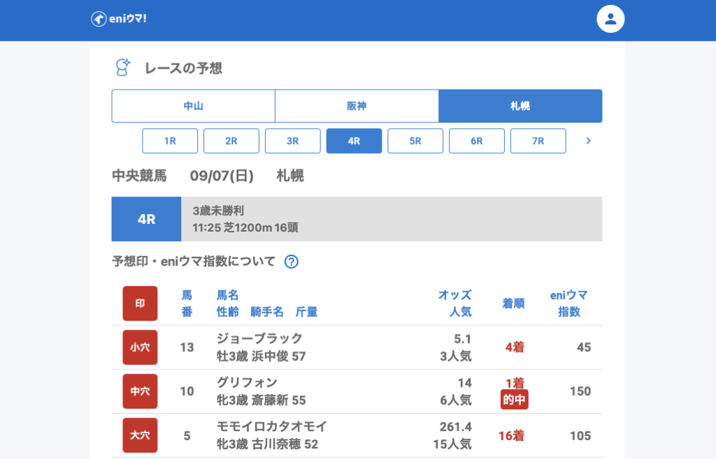札幌は好調で、グリフォン(14.0倍/eniウマ!指数150)、トゥルブレンツ(12.7倍/eniウマ!指数105)、タイキラフター、ジュンラトゥールなどが単勝的中。