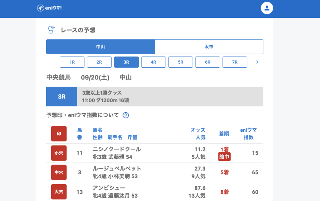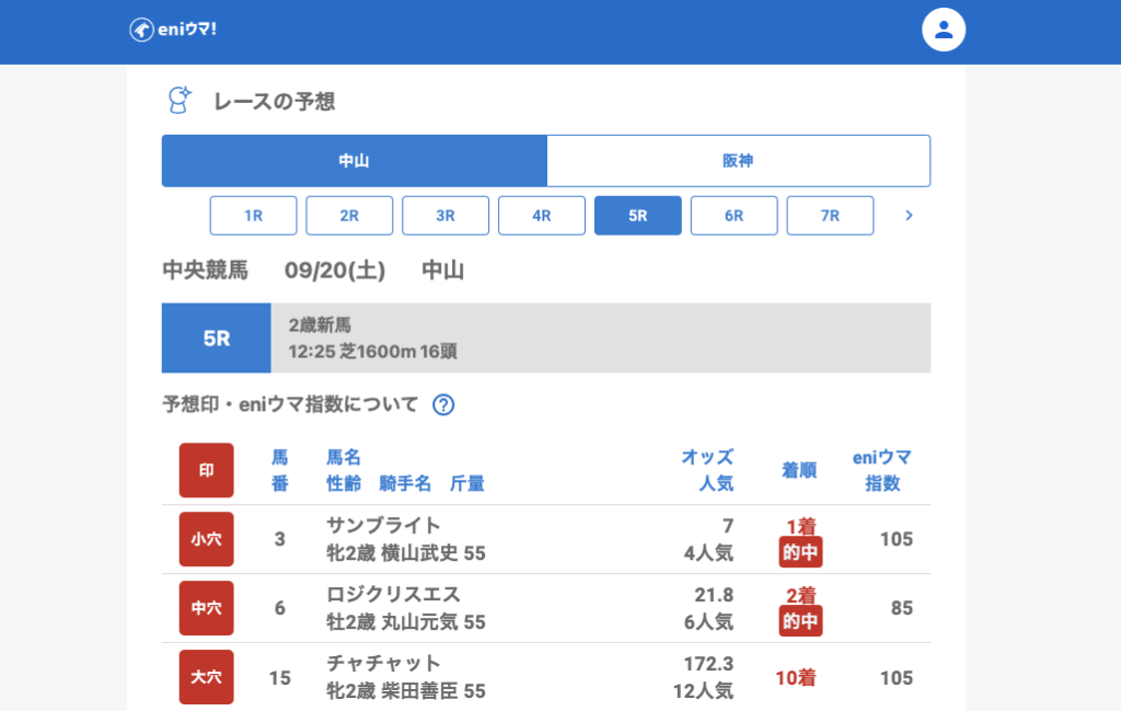中山では3Rでニシノクードクール(11.2倍/指数15)が単勝的中。さらに5Rではサンブライト(7.0倍/指数105)の単勝、ロジクリスエス(21.8倍/指数85)の2着とダブル的中となり、いずれも指数が高く注目できる内容でした。