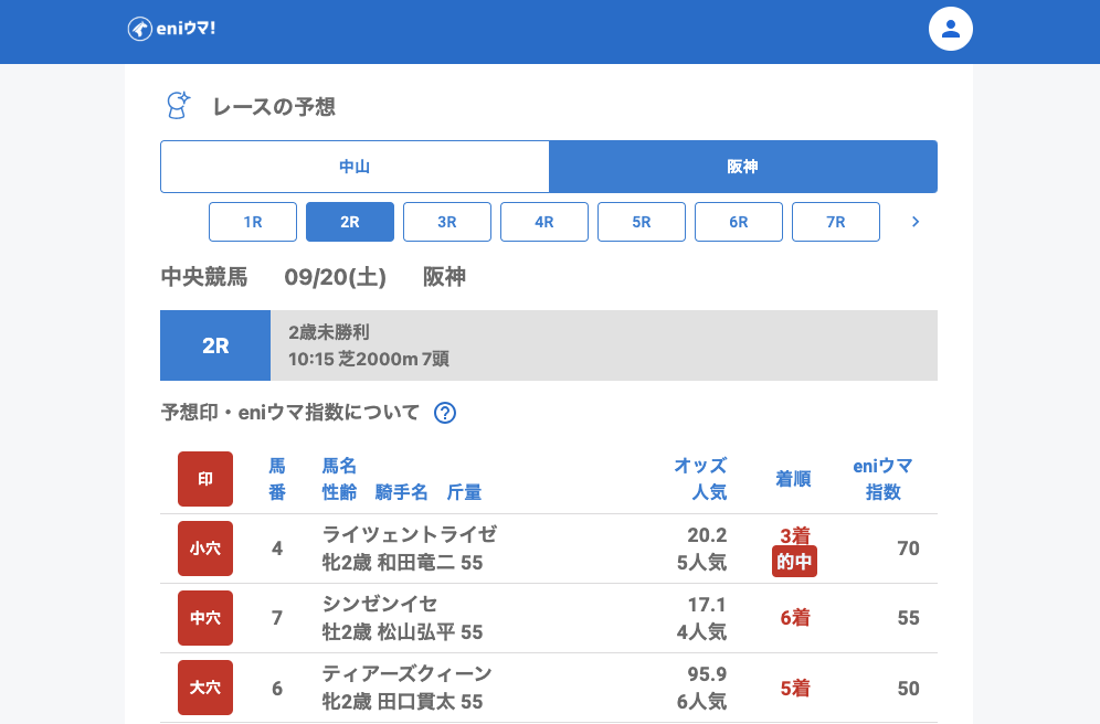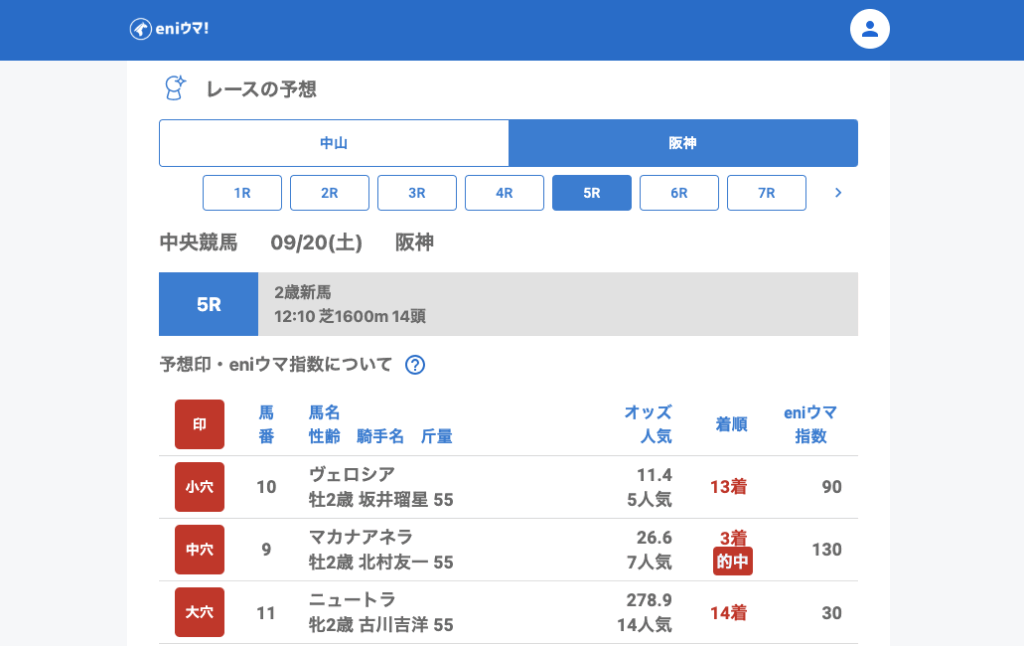 阪神では序盤から好走が続き、1Rジーティースティア(26.5倍/指数30)が2着、2Rライツェントライゼ(20.2倍/指数70)が3着、5Rマカナアネラ(26.6倍/指数130)が3着と、特に高指数馬が複数絡みました。