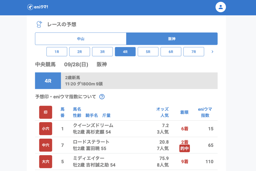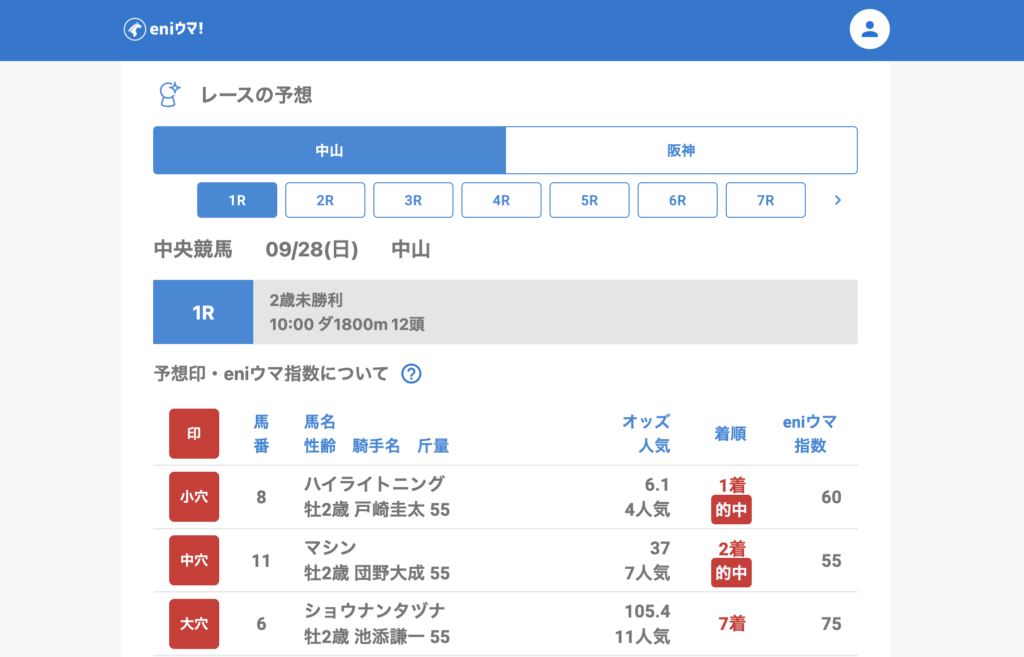中山競馬場では1Rからハイライトニング(6.1倍/eniウマ!指数60)の単勝を皮切りに、マシン(37.0倍/eniウマ!指数55)の2着を的中。