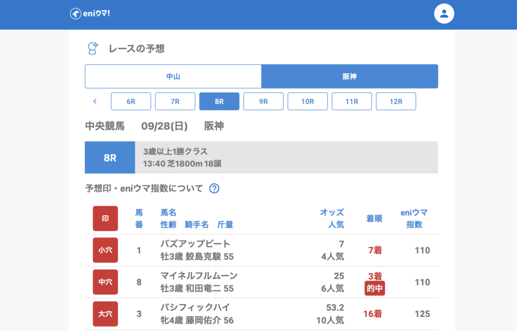小穴で5回、中穴で3回の的中があり、安定した結果を記録。さらに最終12Rでは大穴のカズゴルティス(9.8倍/eniウマ!指数105)が単勝的中し、締めくくりとして妙味ある一撃となりました。