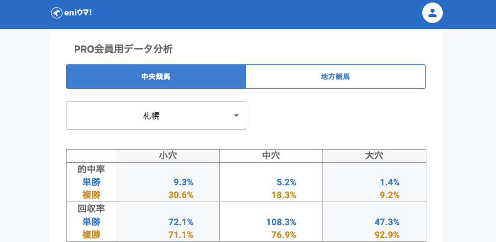 eniウマ!の3年以上の実績データにおいて札幌競馬場で中穴の単勝回収率が108%超 という安定した数値を記録しています。