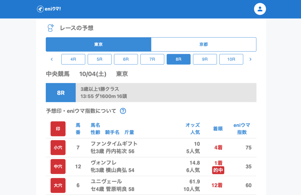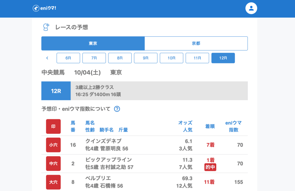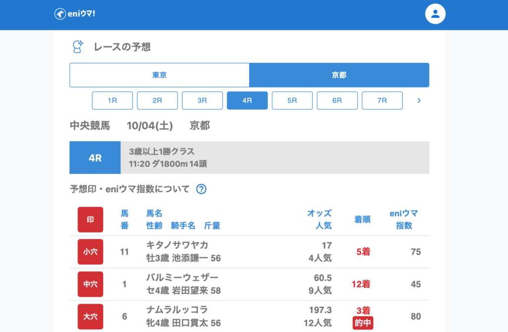4Rでは大穴ナムラルッコラ(197.3倍/eniウマ!指数80)が3着に入り、驚異の高配当を演出。