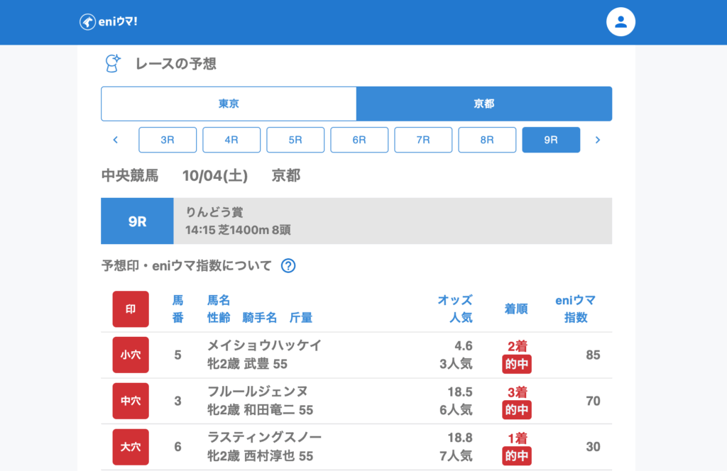 さらに9Rでは小〜大穴の推奨馬がすべて馬券内に入り、単勝18.8倍に加え、3連単79,170円という妙味ある結果に。