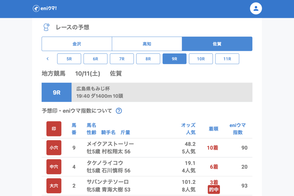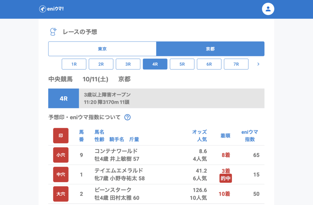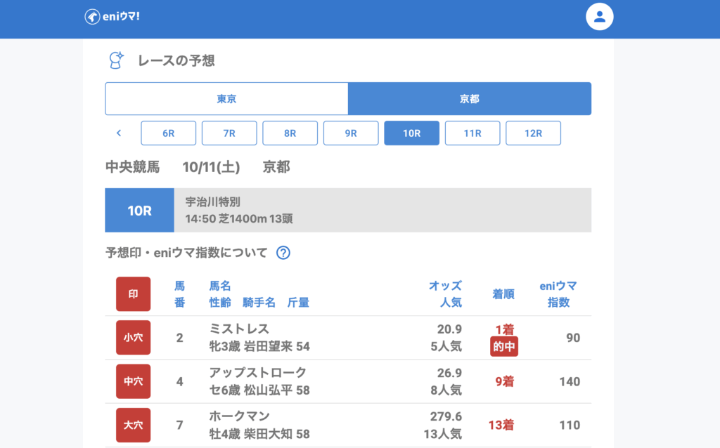 さらに7Rではメアヴィア(46.0倍/eniウマ!指数85)が3着に入り、