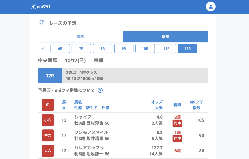 最終レースではワンモアスマイル(8.3倍/eniウマ!指数90)が勝利、小穴3着のダブル的中で締めました。