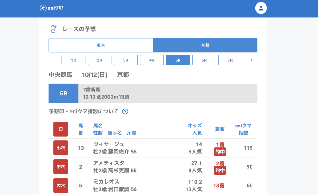特に5Rではヴィサージュ(14.0倍/eniウマ!指数115)が単勝的中、