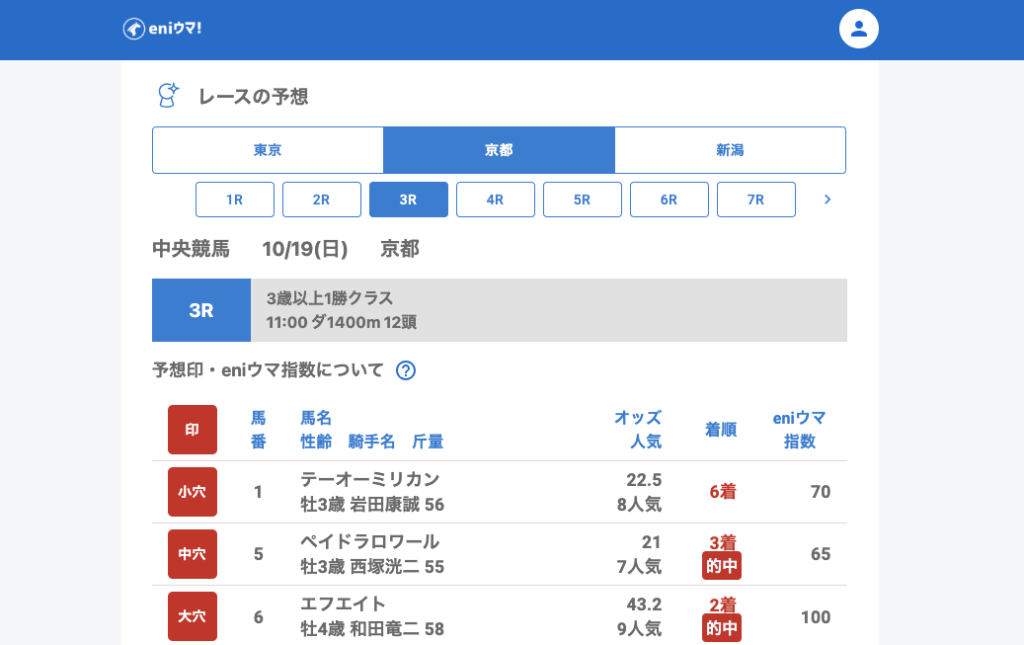他にもツインピークス(68.4倍/eniウマ!指数15)、ランプローグ(34.6倍/eniウマ!指数75)など、