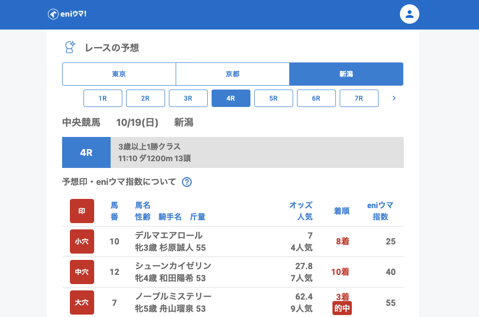 新潟も好調が続き、大穴ノーブルミステリー(62.4倍/eniウマ!指数55)を的中。