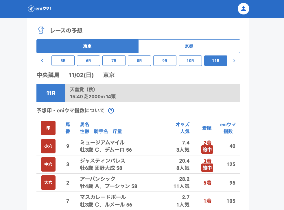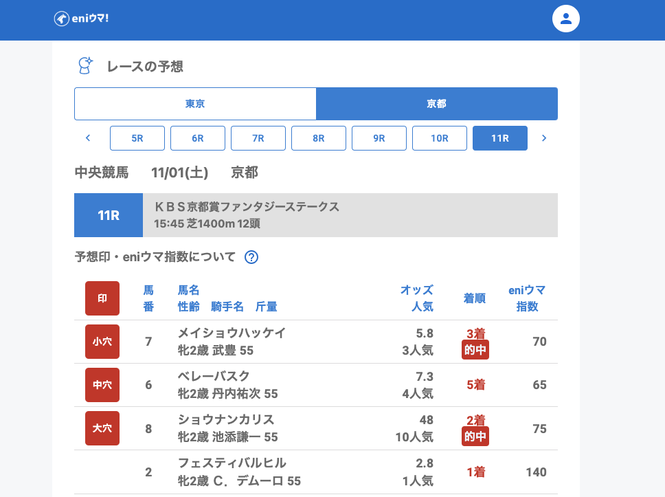 eniウマ!は“穴馬発見器”のため1人気は基本対象外ですが、指数は140と高く、AIも高評価していました。