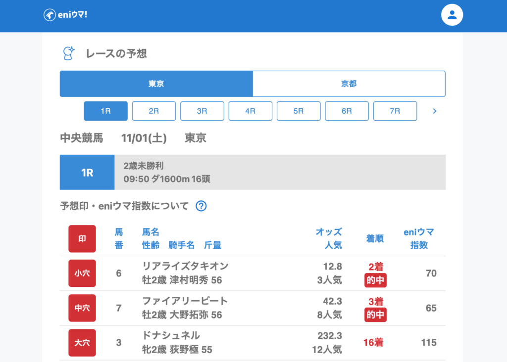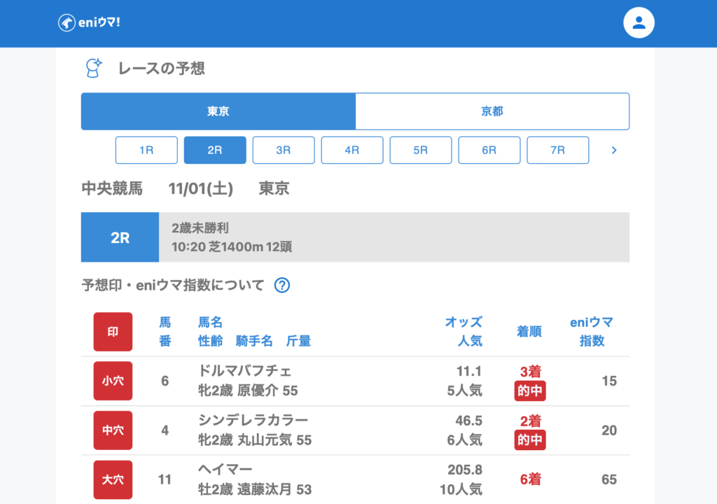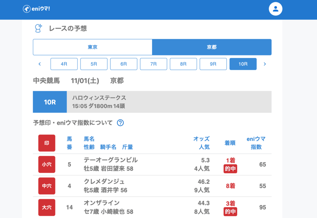 さらに大穴フミサウンド(47.3倍/eniウマ!指数65)やサルヴァトーレ(18.2倍/eniウマ!指数85)を的中し、高配当も押さえる結果に。的中率の高さが際立ちました。