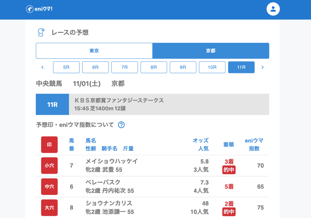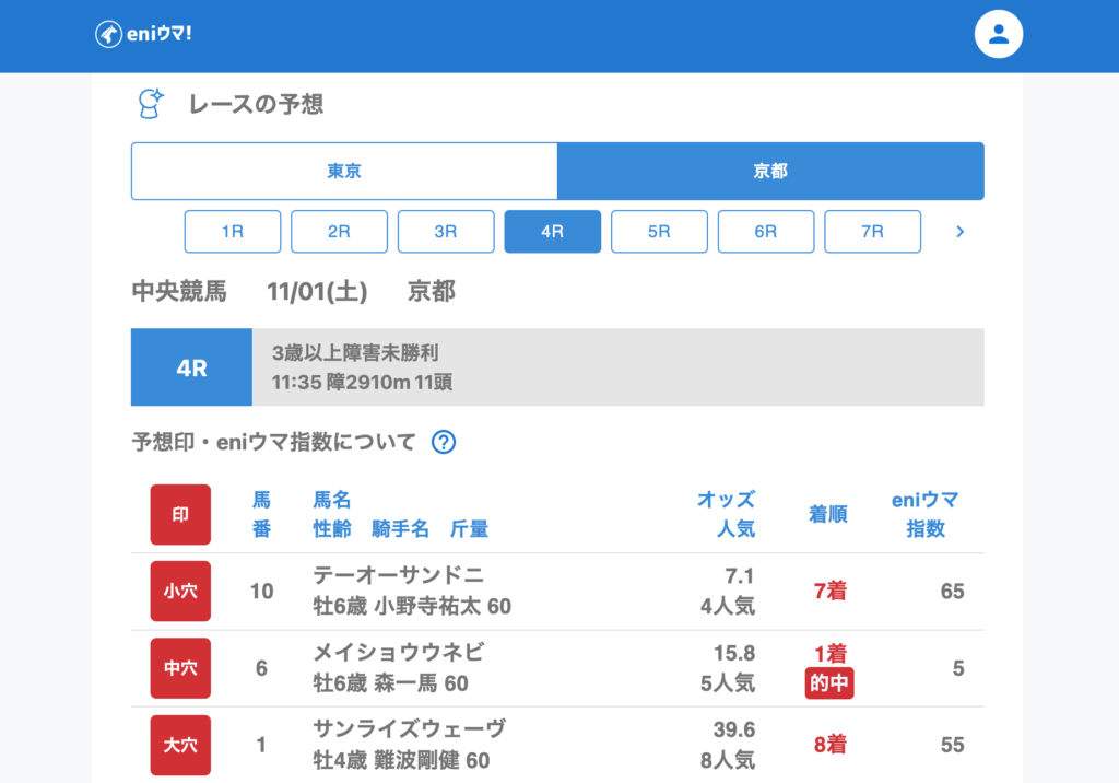 京都でも単勝メイショウウネビ(15.8倍/eniウマ!指数5)を的中。