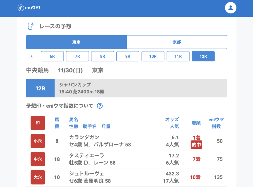 ジャパンカップでは小穴カランダガン6.1倍【50】の単勝をしっかり的中しました。
