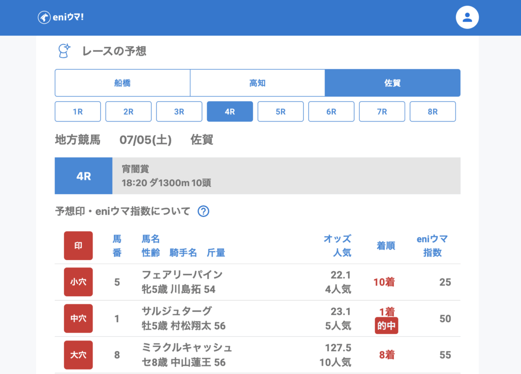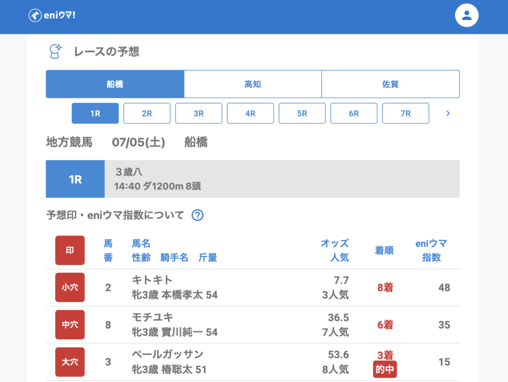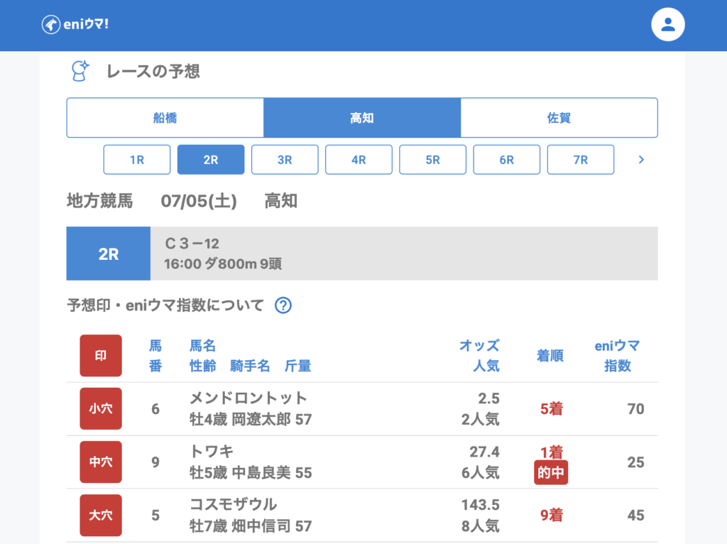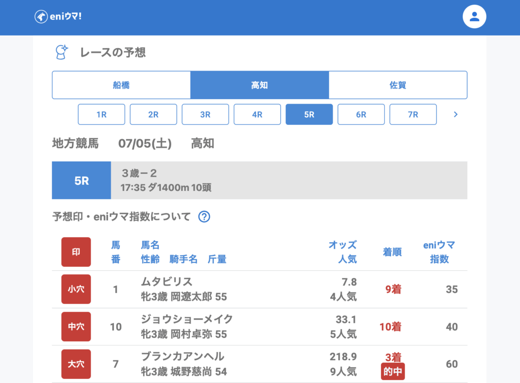 eniウマ!指数で100をマークしたキタカラキタテンシが1着に。