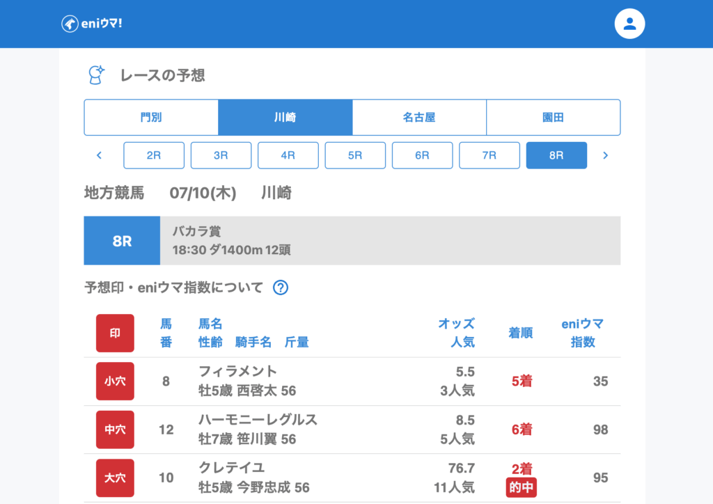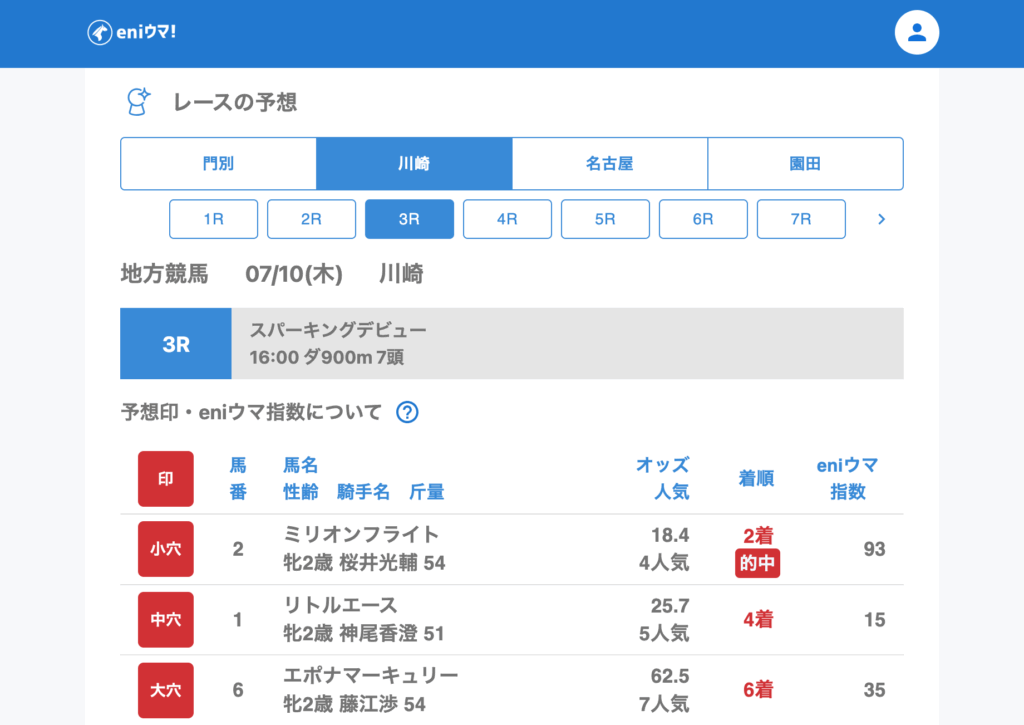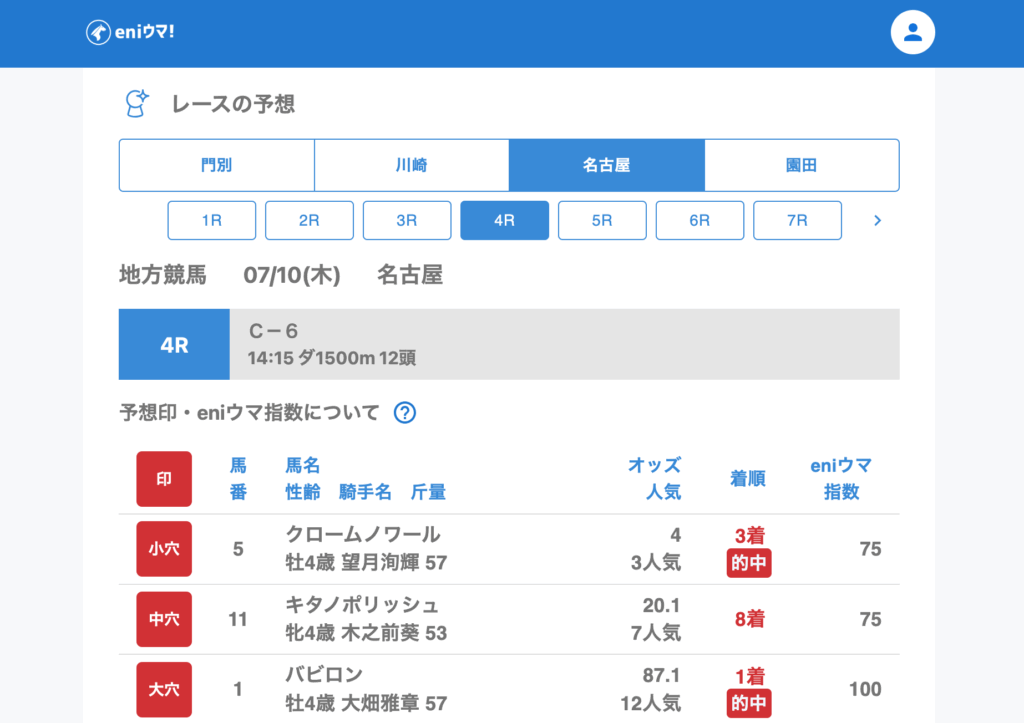 バビロン(87.1倍/eniウマ!指数100)やクレテイユ(76.7倍/eniウマ!指数95)といった超高配当の激走に加え、ミグラテール(15.2倍/eniウマ!指数100)、ミリオンフライト(18.4倍/eniウマ!指数93)など、eniウマ!指数高評価馬も結果を残しています。