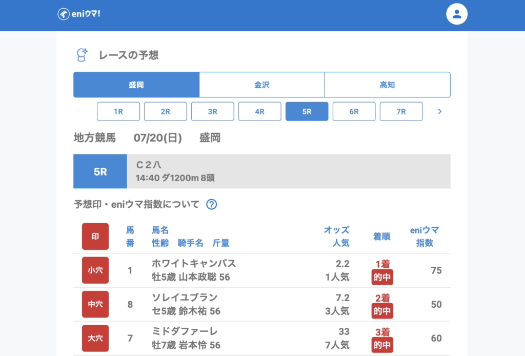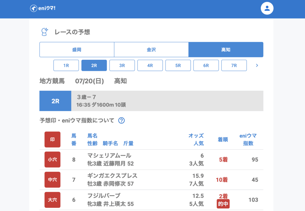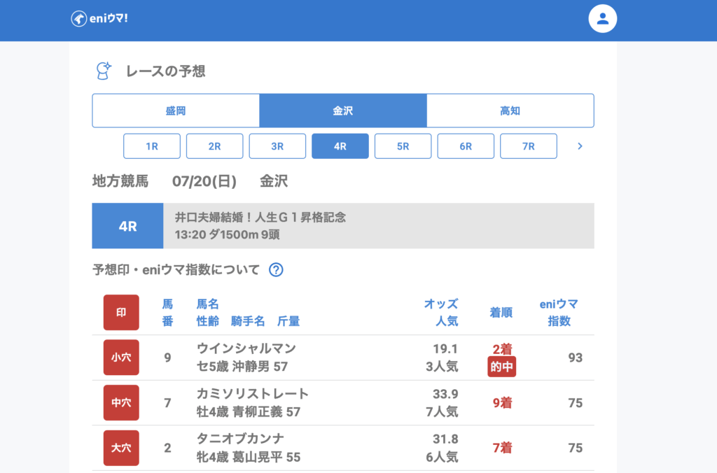 本日は高配当の穴馬が複数馬券圏内に入り、eniウマ!指数50〜100超えまで幅広い好走が見られました。