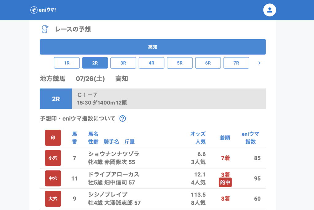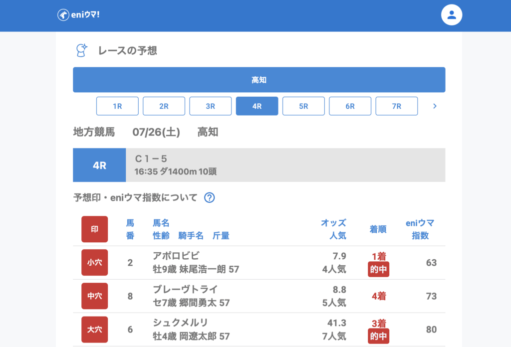 本日はeniウマ!指数40〜95が的中し、2桁配当〜40倍超までバランスよく的中。
