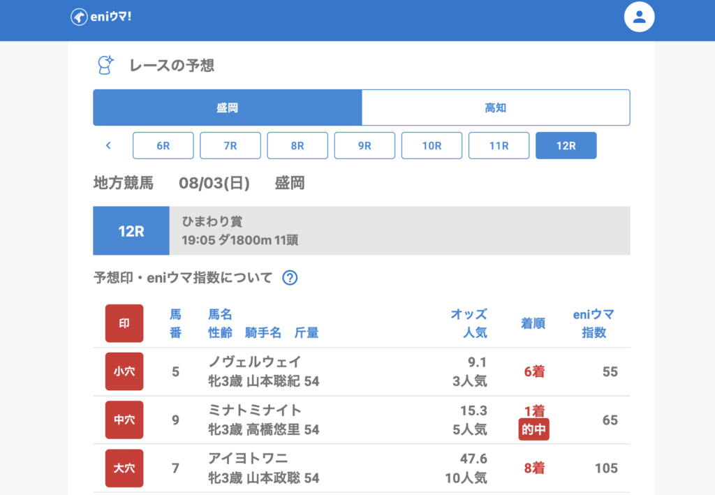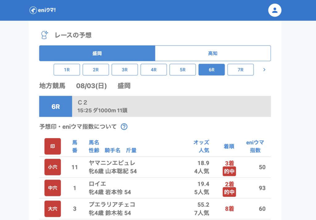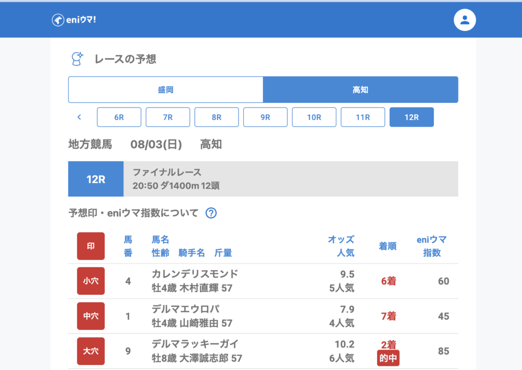 高知8Rでは、eniウマ指数【50】ながら単勝110.8倍という超特大馬券を的中🎯