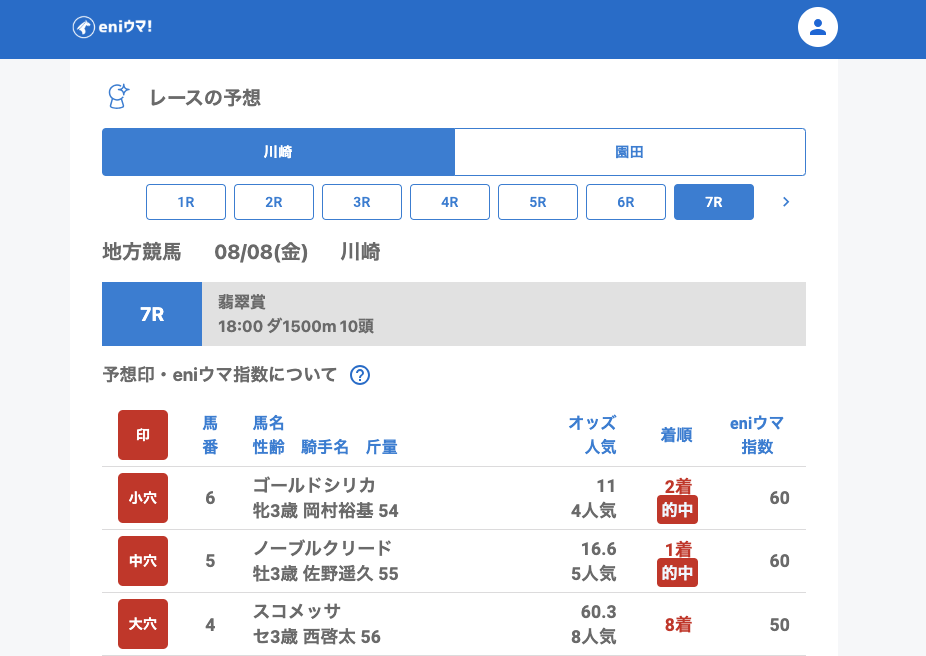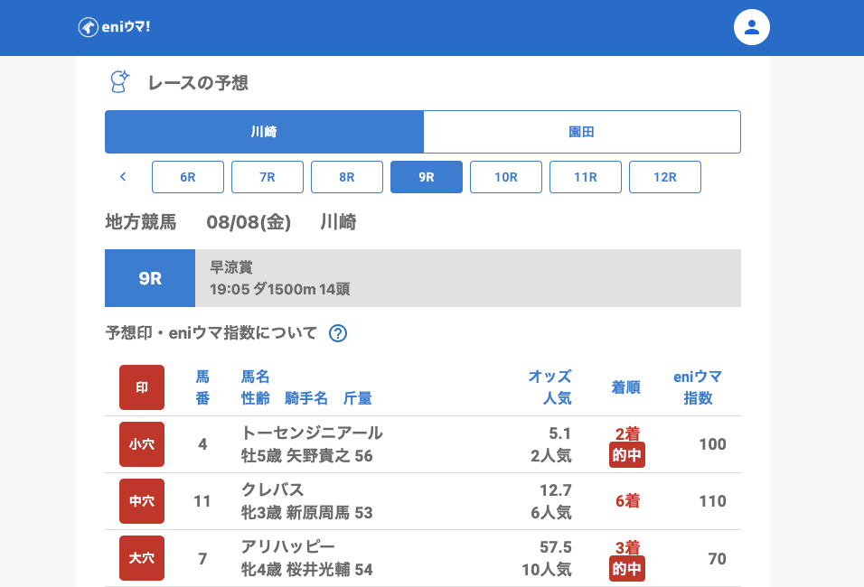 この日は川崎でリコーベレッタ(36.1倍/eniウマ!指数80)やアリハッピー(57.5倍/eniウマ!指数70)、園田ではノーブルクリード(16.6倍/eniウマ!指数60)など、しっかりと穴馬を見つけることができました。