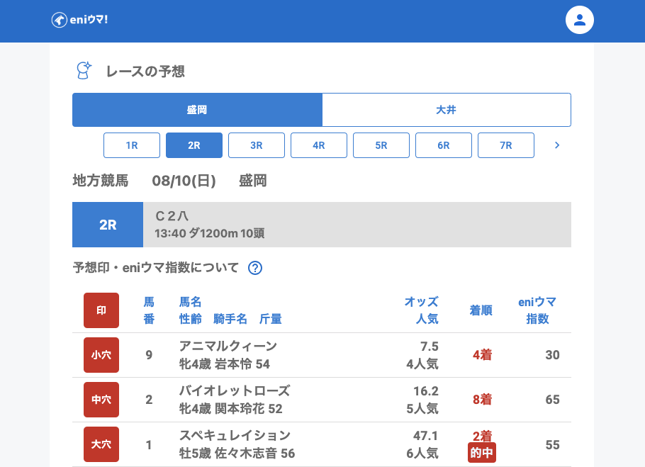 盛岡9Rではガンバンテイン(18.3倍/eniウマ!指数75)がしっかり単勝を射止め、大井1Rではビートリニティ(4.8倍/eniウマ!指数75)が2人気に応えて快勝しました。