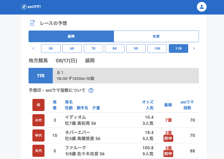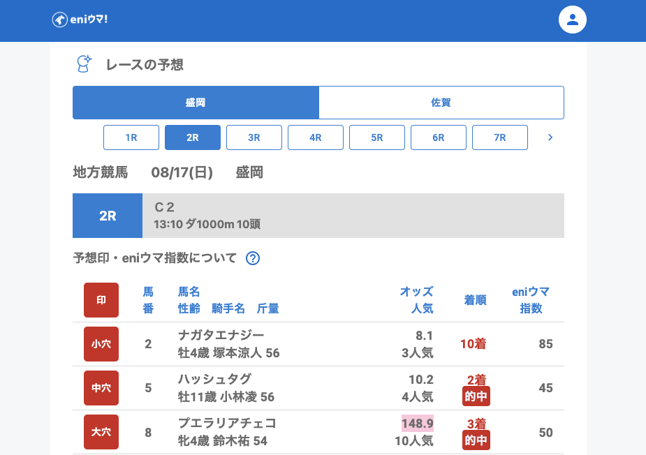 盛岡では、2Rでハッシュタグ(eniウマ!指数45)が前走に続き馬券圏内を確保し2着、プエラリアチェコ(148.9倍/eniウマ!指数50)も指数低めながら3着と健闘。また、11Rではネバーエバー(18.4倍/eniウマ!指数45)とファルーク(100.8倍/eniウマ!指数88)が的中しました。