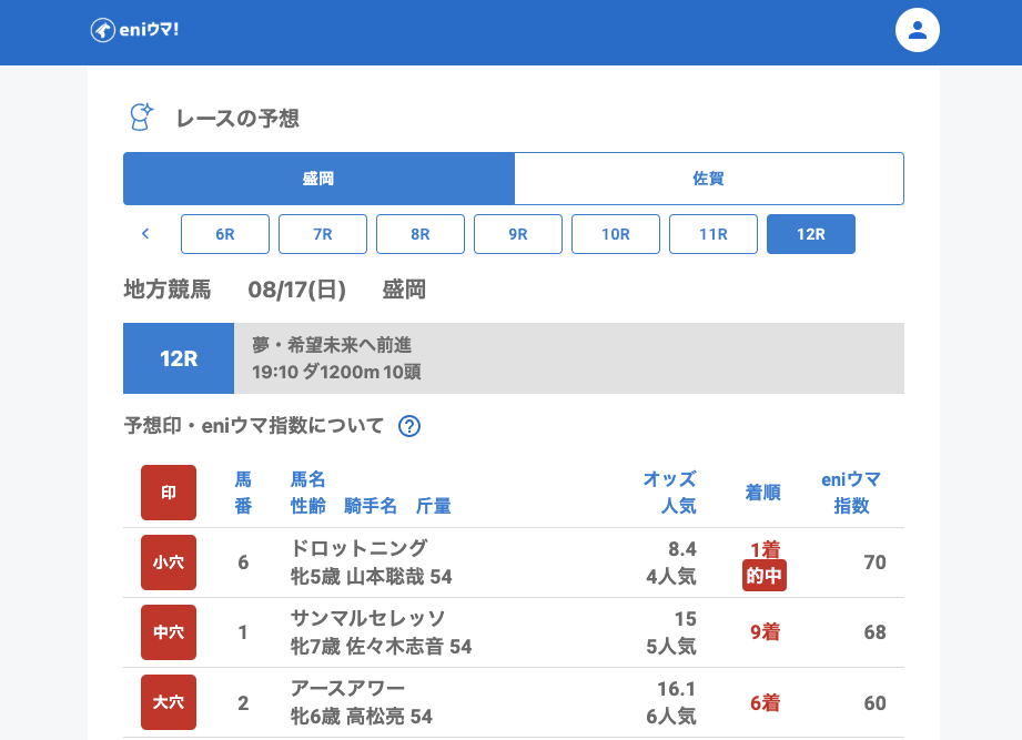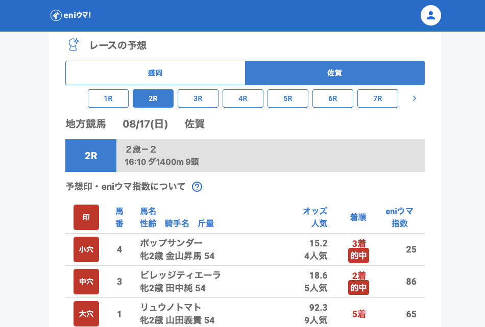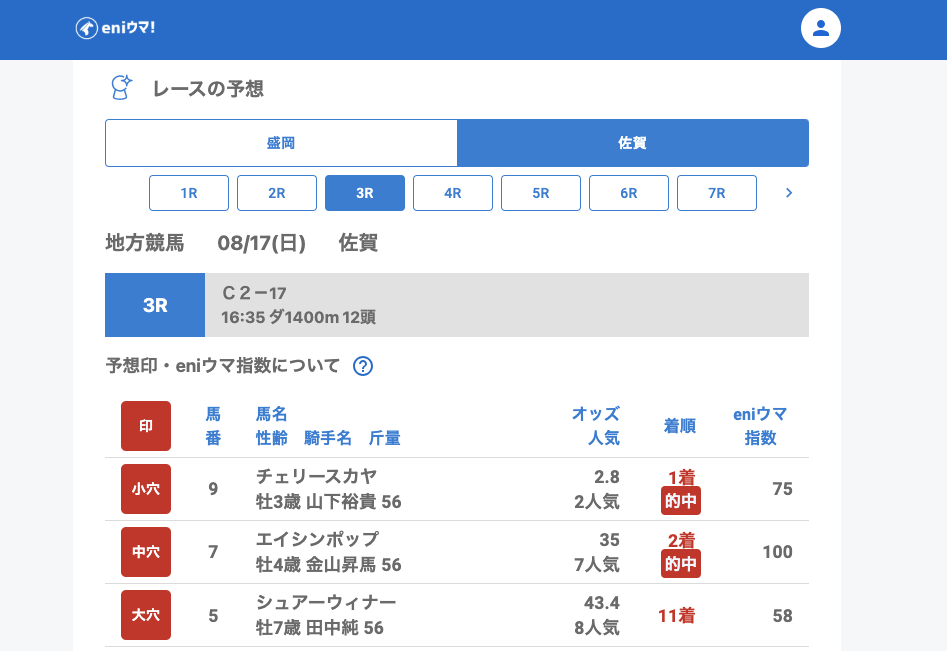 一方、佐賀では3Rでエイシンポップ(35.0倍/eniウマ!指数100)がしっかり結果を出し、指数100の裏付けを感じさせる走りでした。