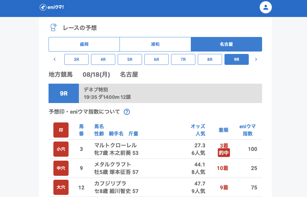 的中は多かった一方で、eniウマ!指数は全体的に低め。高指数の推奨は少なめでしたが、指数50前後からも馬券圏内に届く穴馬をしっかり発見できました。