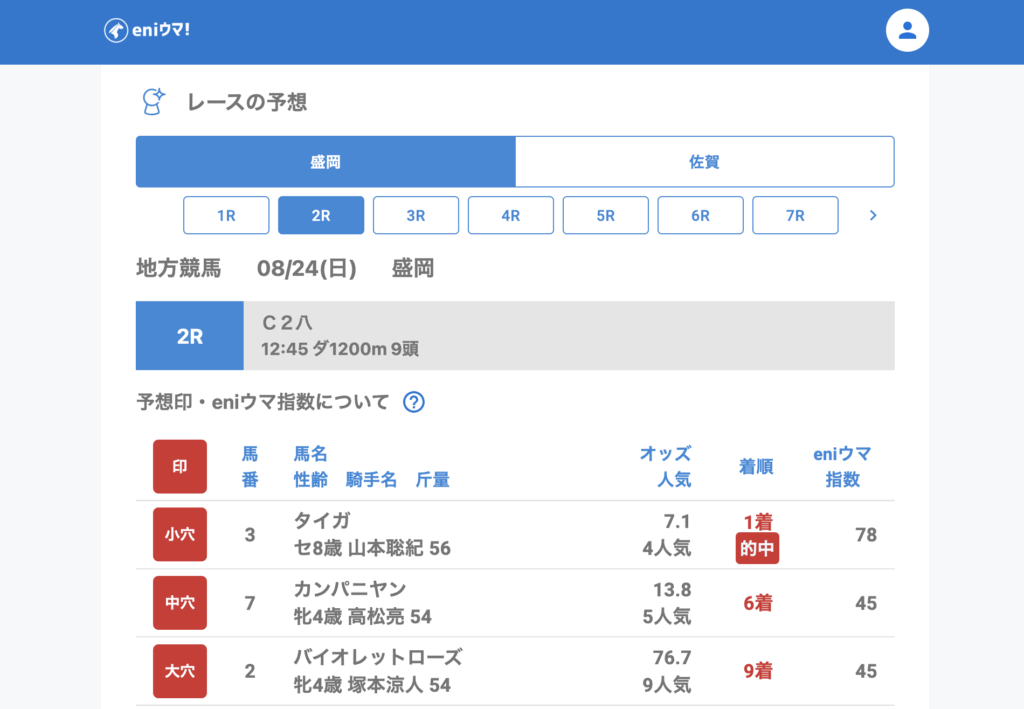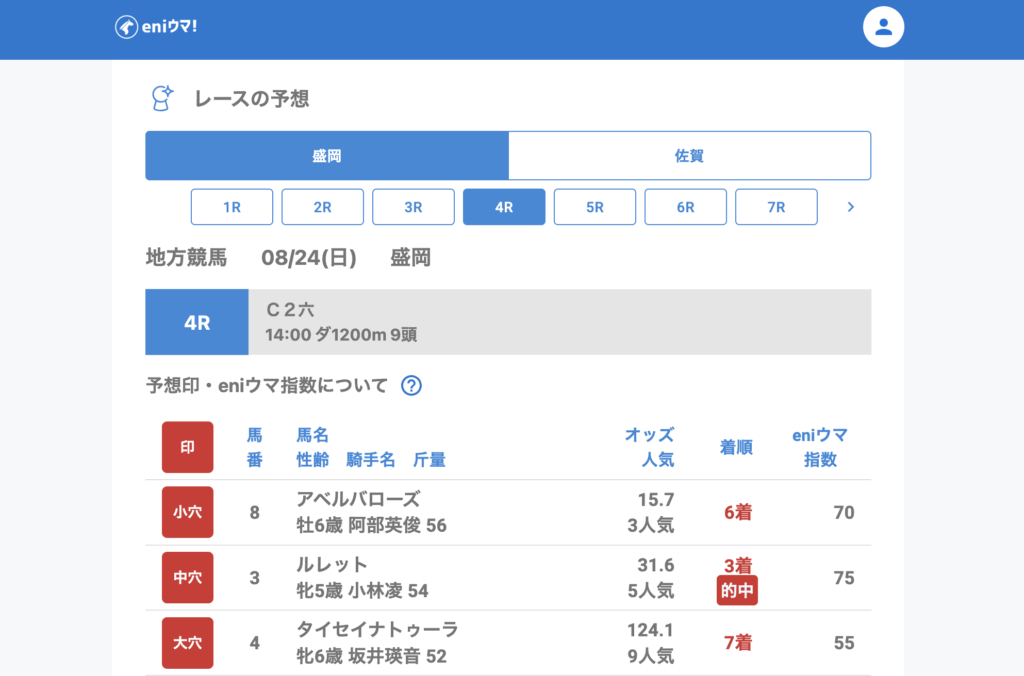 佐賀では大きく荒れる展開が目立ったものの、大穴を拾い切れず苦しい結果に。一方で盛岡ではワンダーフルーリ(27.9倍/eniウマ!指数65)、ルレット(31.6倍/eniウマ!指数75)といった馬をしっかり推奨できており、安定感のある的中となりました。