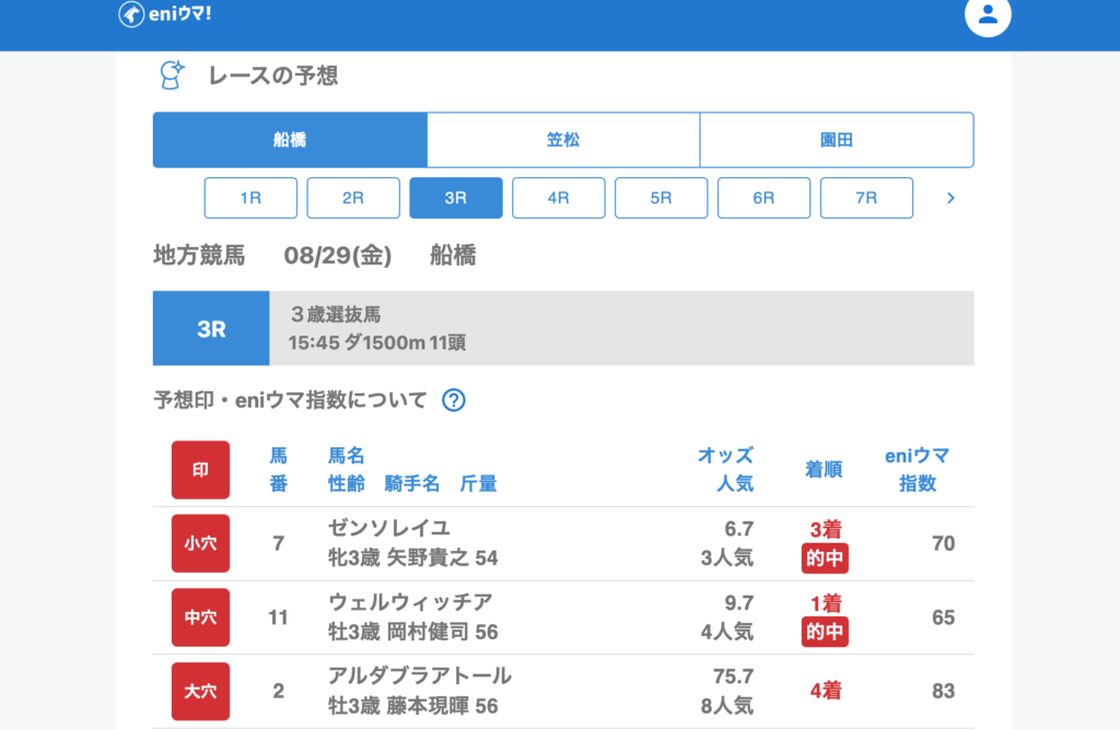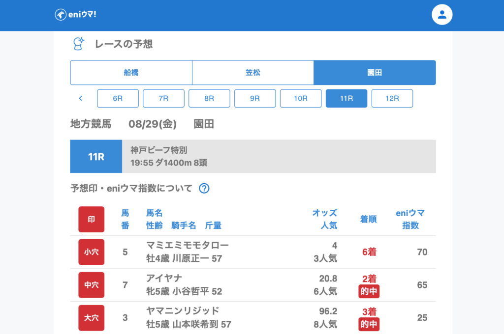 船橋では3Rで中穴ウェルウィッチア(9.7倍/eniウマ!指数65)を単勝的中。笠松では6Rでeniウマ!指数100超えのライチトゥーム(22.9倍/eniウマ!指数103)が2着、さらに11Rではeniウマ!指数は低めながらスペシャルトーク(52.2倍/eniウマ!指数25)の大穴を発見しました。園田11Rでも穴馬を2頭拾い、中穴アイヤナ(eniウマ!指数103)が2着、大穴ヤマニンリジッド(eniウマ!指数25)が3着としっかり結果を残しています。