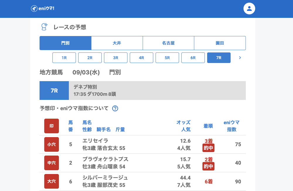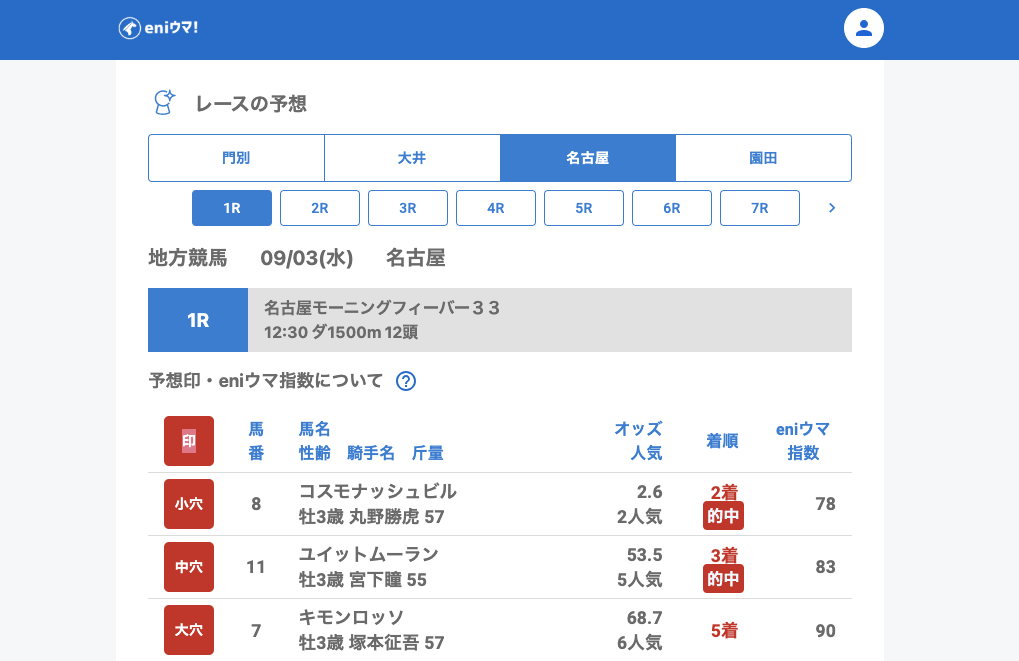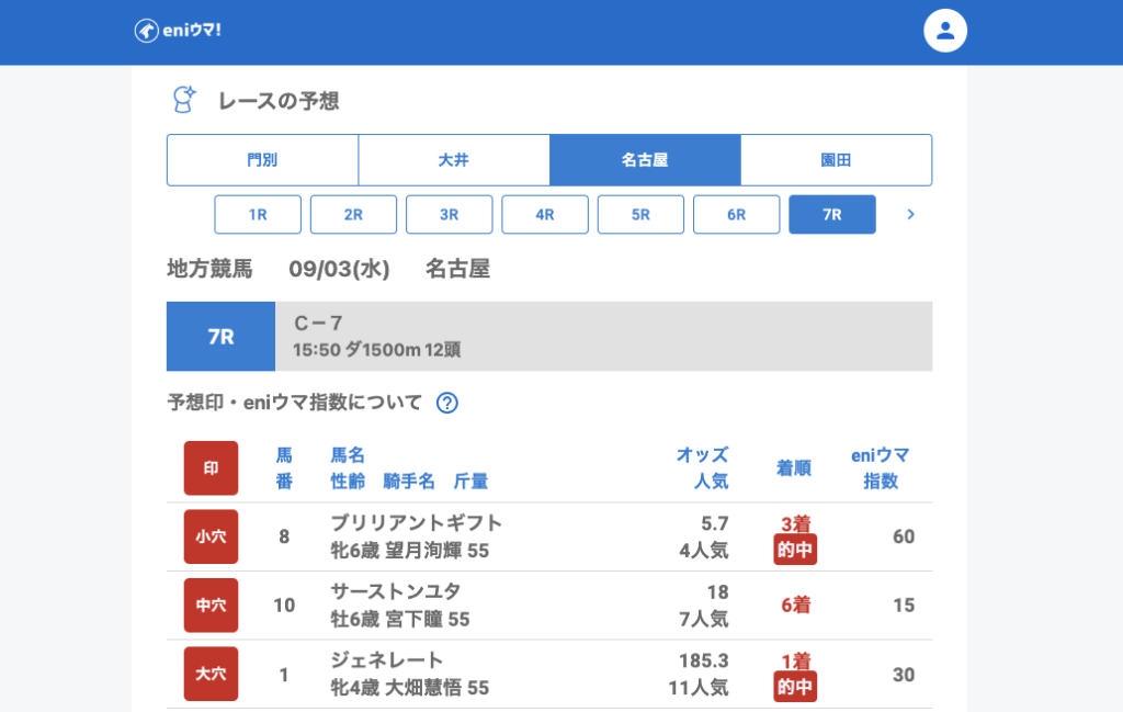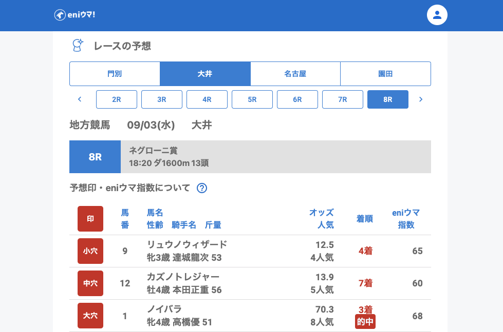 その中で8Rでは大穴ノイバラ(70.3倍/eniウマ!指数68)が3着、重賞では中穴ドリームビリーバー(40.3倍/eniウマ!指数78)が3着と、穴馬を発見することができました。