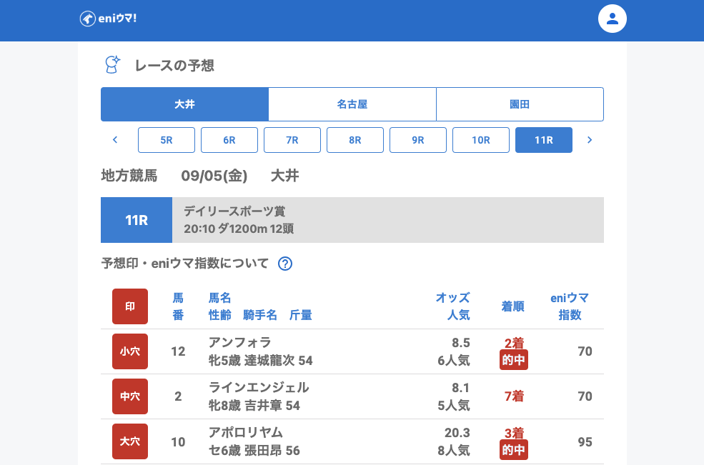 大井では3Rでフラワーガールエス(48.7倍/eniウマ!指数53)が3着に入り、さらに5R・6Rでは単勝を連続的中することができました。