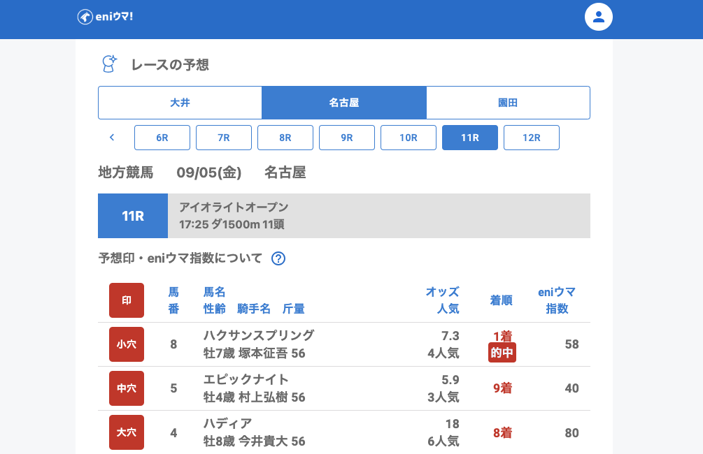名古屋では3Rでサンパギータチャン(15.3倍/eniウマ!指数15)の単勝を発見。6Rでは小穴・中穴・大穴の全てを的中させるなど安定感を発揮し、さらに11R・12Rでは連続で単勝を発見しました。