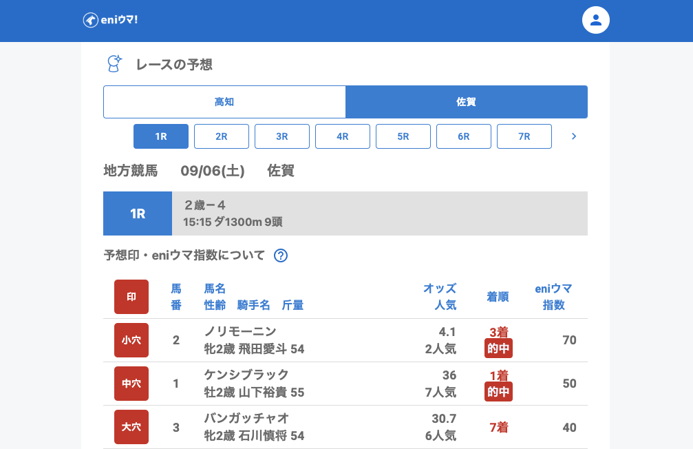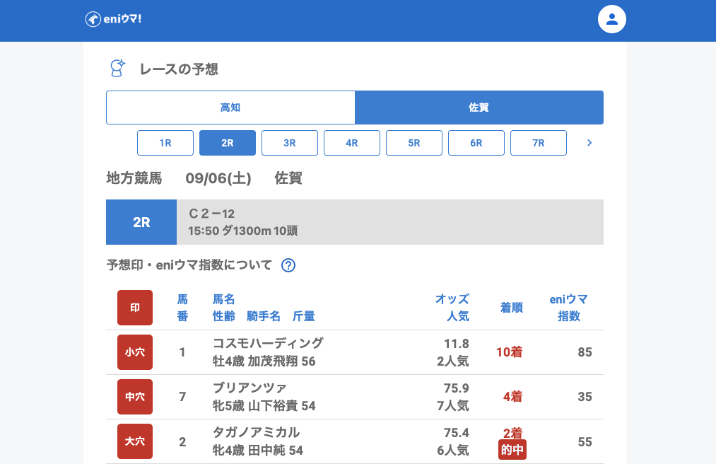 佐賀は全体的に好調な一日。1Rでケンシブラック(36.0倍/eniウマ!指数50)の単勝を発見すると、2Rではタガノアミカル(75.4倍/eniウマ!指数55)が2着に入り、続くレースでも複数の穴馬を拾うことができました。