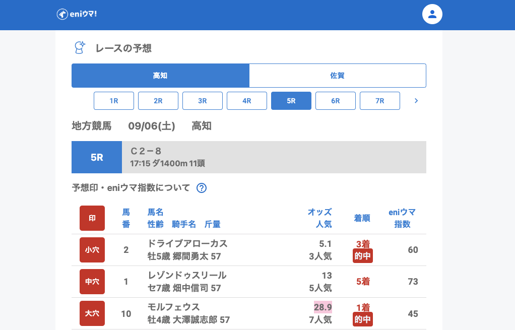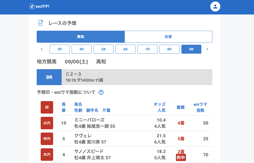 高知では5Rでモルフェウス(28.9倍/eniウマ!指数45)の単勝を発見し、9Rではサノノスピード(18.2倍/eniウマ!指数70)が2着に好走しました。一方で4R・7Rでは穴馬が上位に来ていながら発見に至らず、惜しい内容もありました。