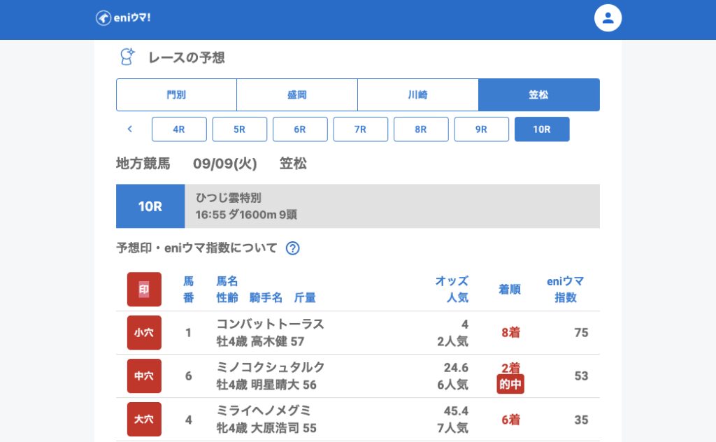 笠松では7R〜10Rで連続的中。サンセットカラー(20.1倍/eniウマ!指数85)、ゴールウェイガール、トゥルーグリット(14.4倍/eniウマ!指数83)、ミノコクシュタルク(24.6倍/eniウマ!指数53)と中穴をしっかり拾い、見どころの多い内容となりました。