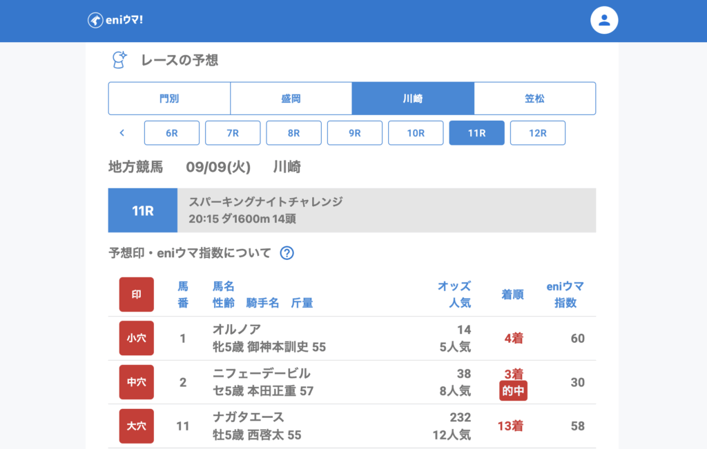 川崎では9Rアマモト(29.5倍/eniウマ!指数95)が2着。