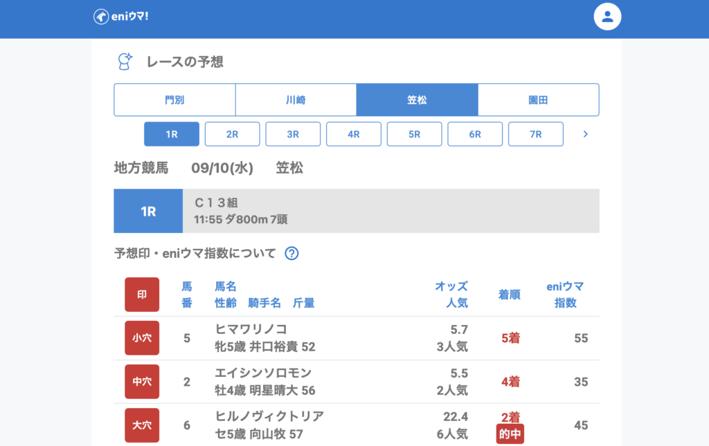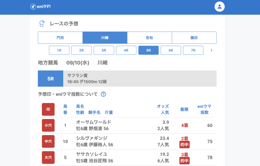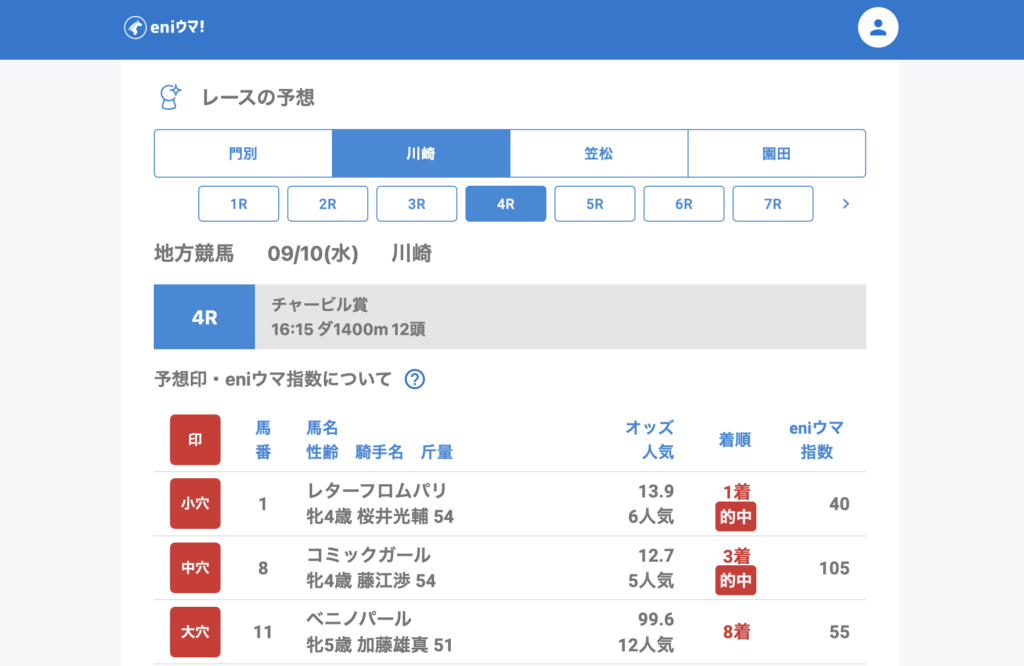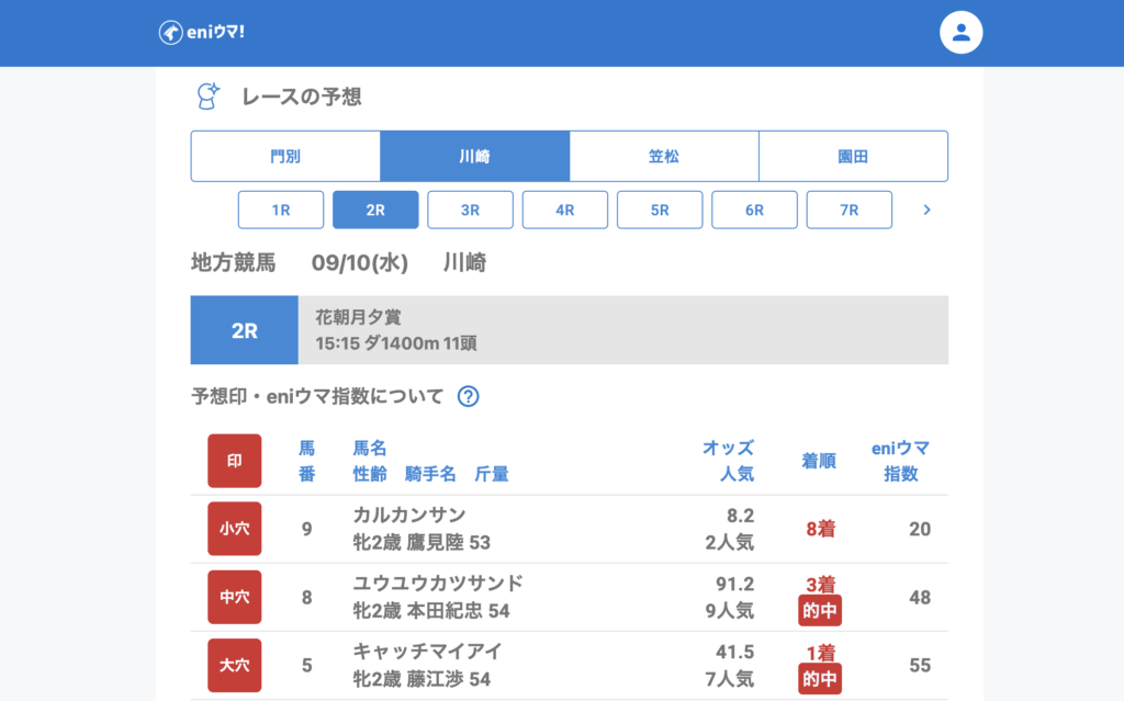川崎は好調で、2Rでキャッチマイアイ(41.5倍/eniウマ!指数55)の単勝とユウユウカツサンド(91.2倍/eniウマ!指数48)の3着をダブル的中。