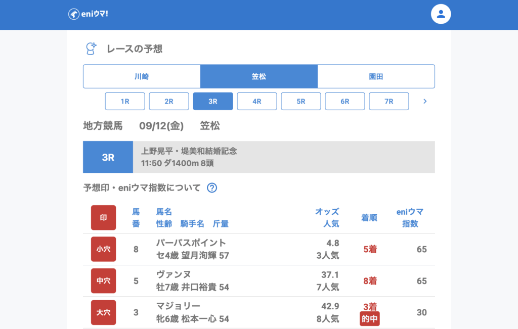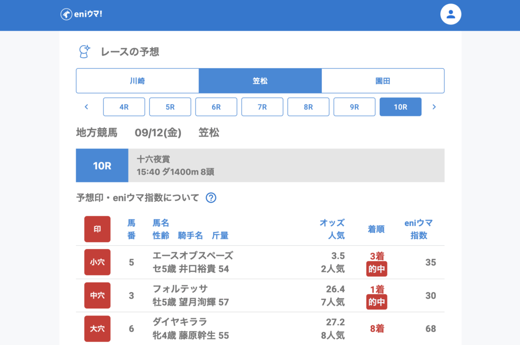 笠松は引き続き好調で、3Rマジョリー(42.9倍/eniウマ!指数30)、6Rミックスアップ(64.3倍/eniウマ!指数65)がともに3着に好走。さらに10Rではフォルテッサ(26.4倍/eniウマ!指数30)が単勝的中と、妙味のある結果が目立ちました。