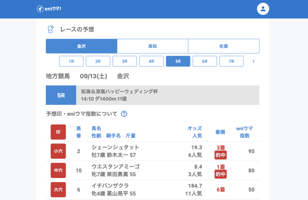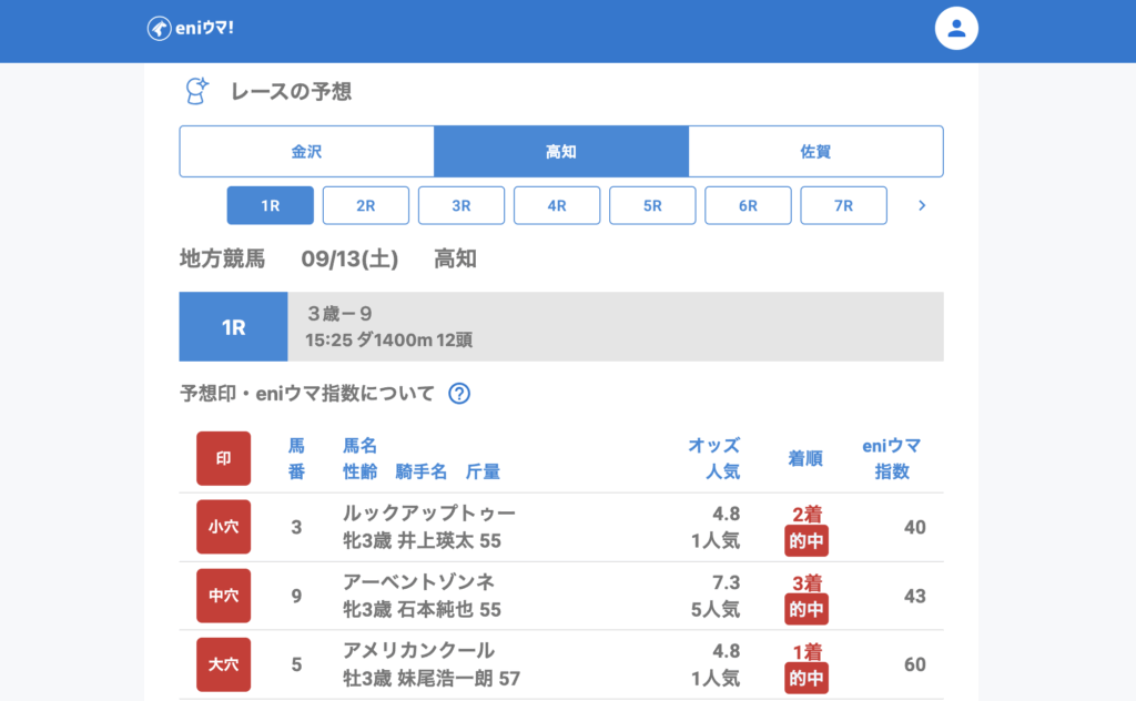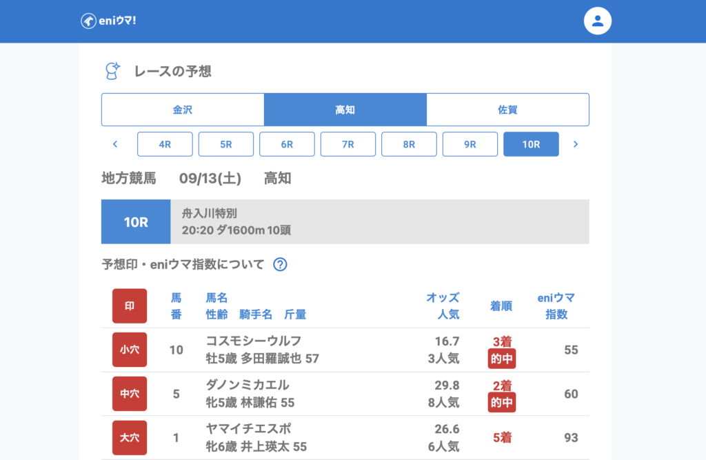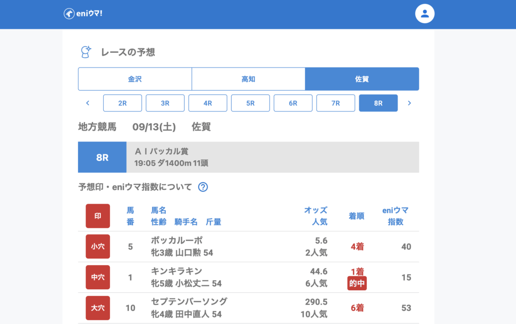 佐賀では4Rレットイットゴー(57.8倍/eniウマ!指数55)が3着に入り、8Rではキンキラキン(44.6倍/eniウマ!指数15)が単勝的中。